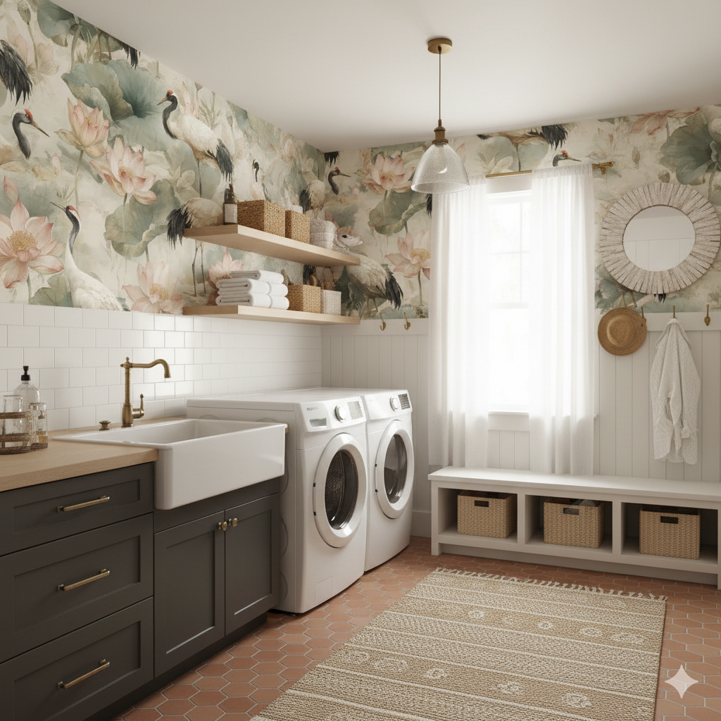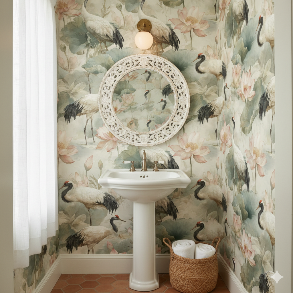 Graceful cranes step among vast lotus blooms, their slender silhouettes highlighted against a misty watercolor background. The blush pink petals, soft sage leaves, and subtle washes of gray and cream create a composition that is serene yet commanding, blending Asian artistry with modern elegance. Lotus Crown is ideal for creating a calming focal wall in bedrooms, meditation spaces, or luxury bathrooms. Its muted palette allows it to pair with marble, light wood, or minimalist furnishings, bringing a tranquil sophistication wherever it is installed.
