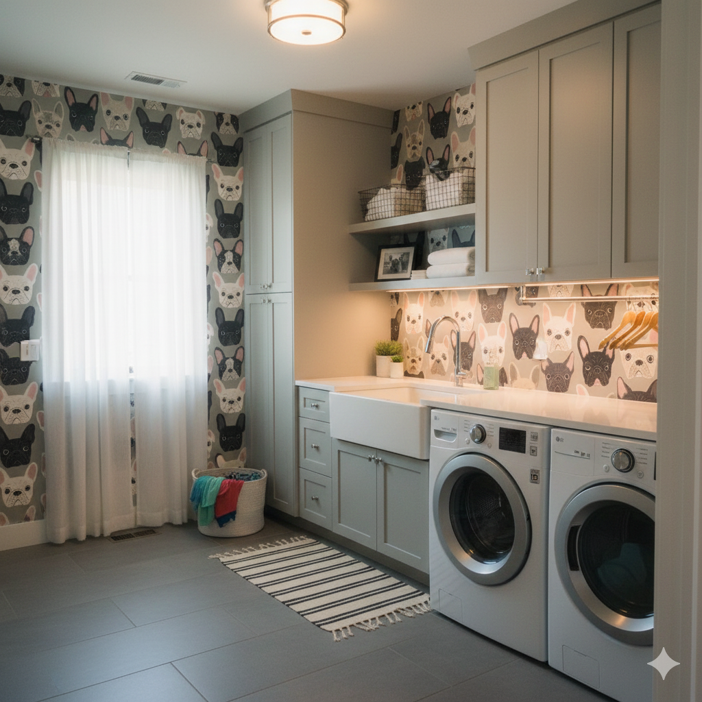This design works beautifully in eclectic interiors, nurseries with designer flair, modern powder rooms, or even boutique pet salons that want to add a wink of personality without losing luxury. It pairs effortlessly with pale oak, brass, and dusty blush accents — transforming ordinary walls into a conversation piece that feels curated, clever, and unmistakably French.