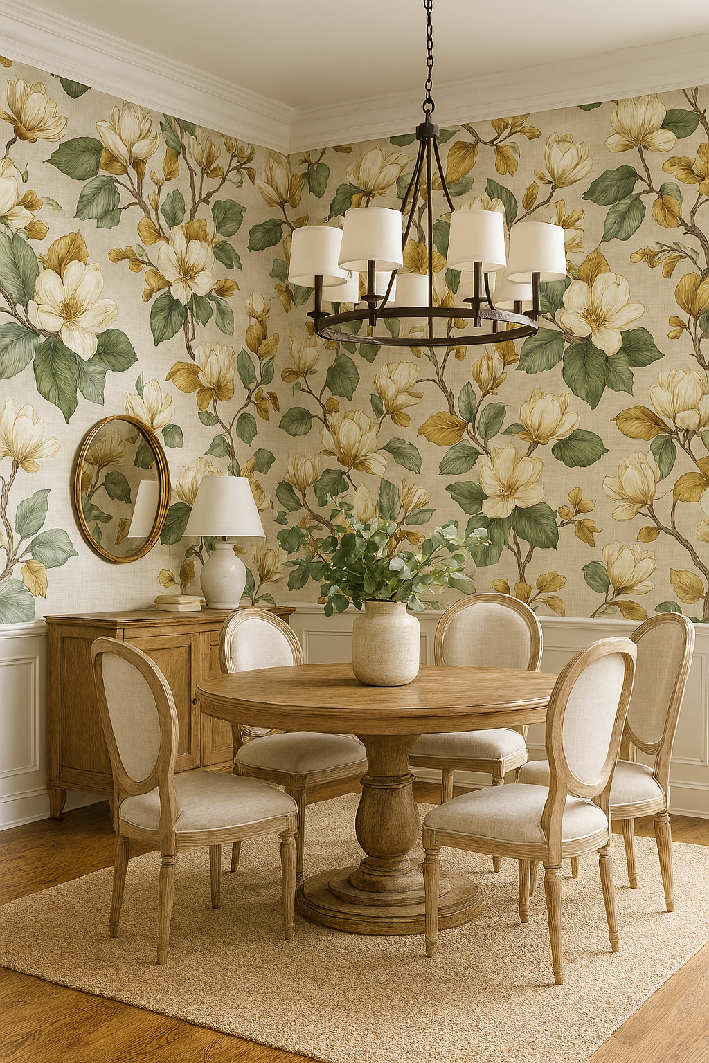 Fine-line illustrations of magnolia blossoms and leaves unfurl across the surface in a vintage botanical style. This monochrome floral wallpaper brings old-world elegance to any space and is especially suited for bathrooms, hallways, or home offices that crave understated beauty with Southern charm.