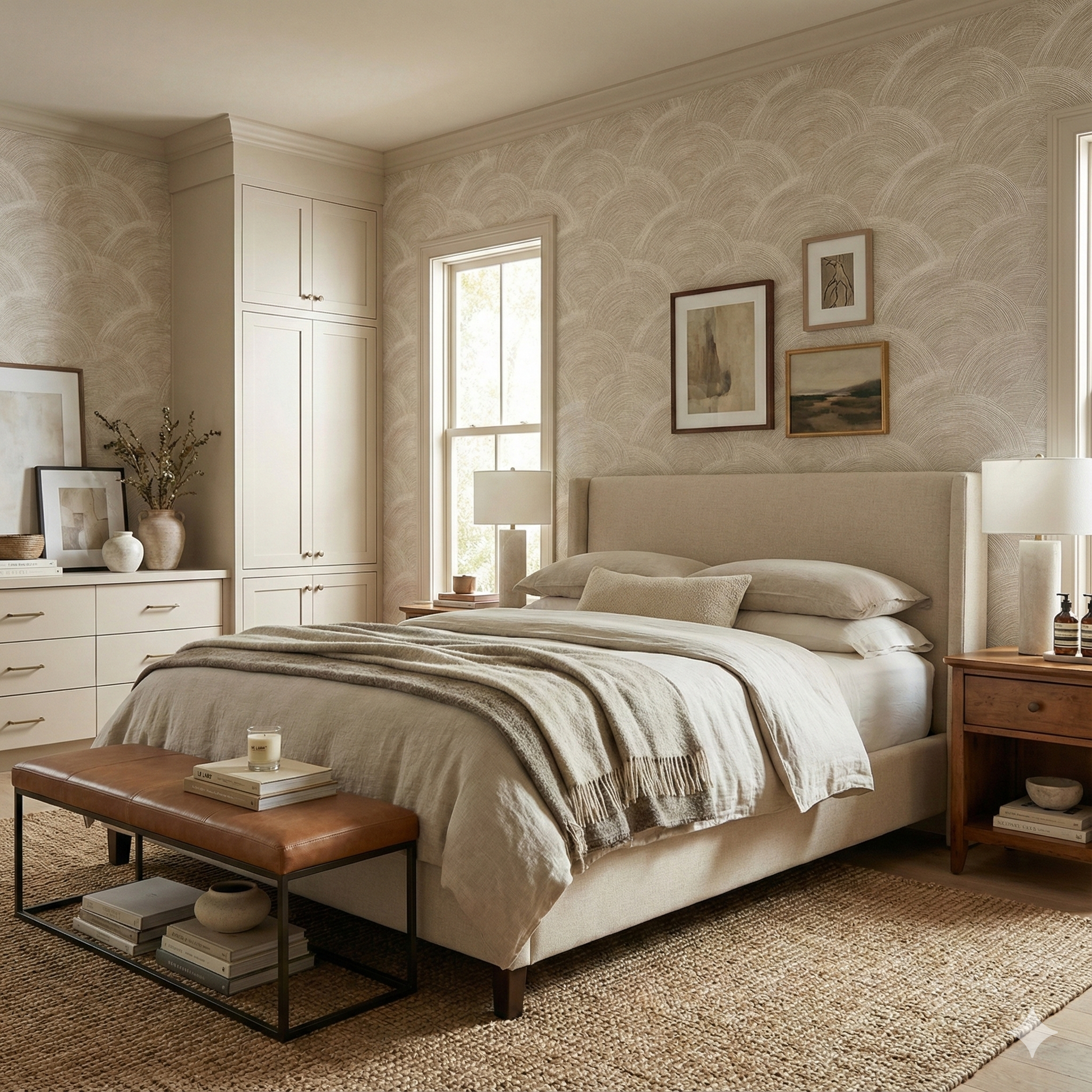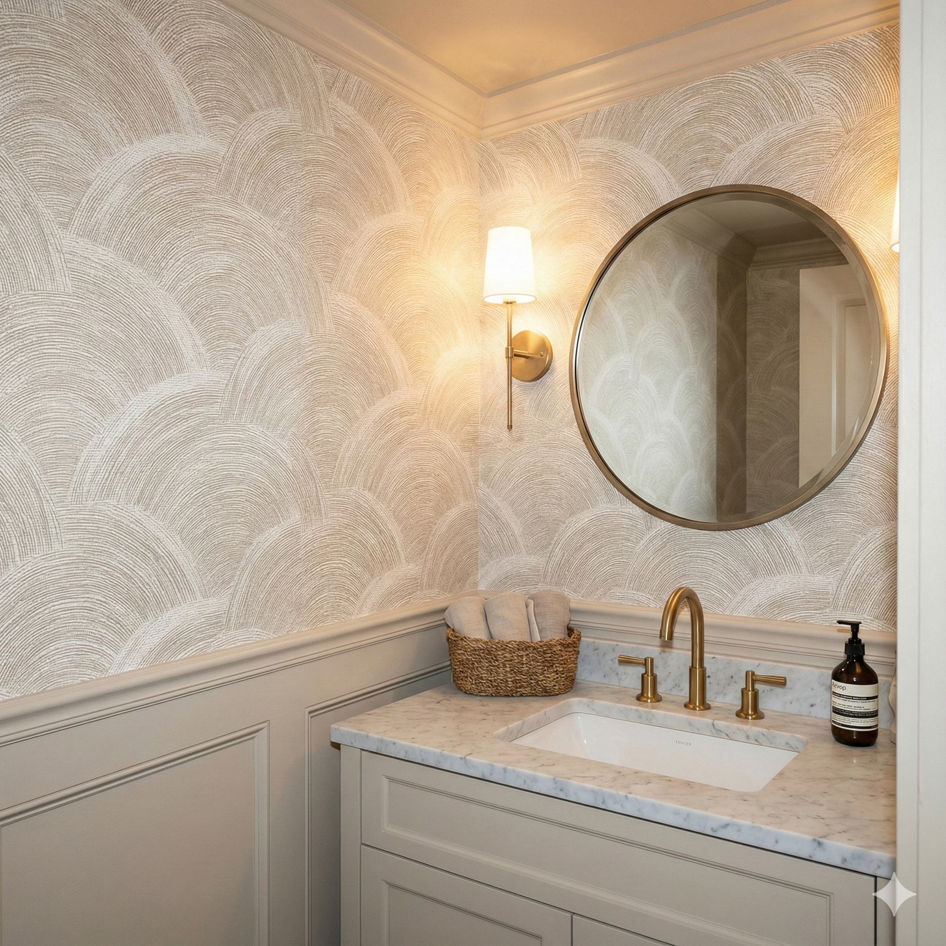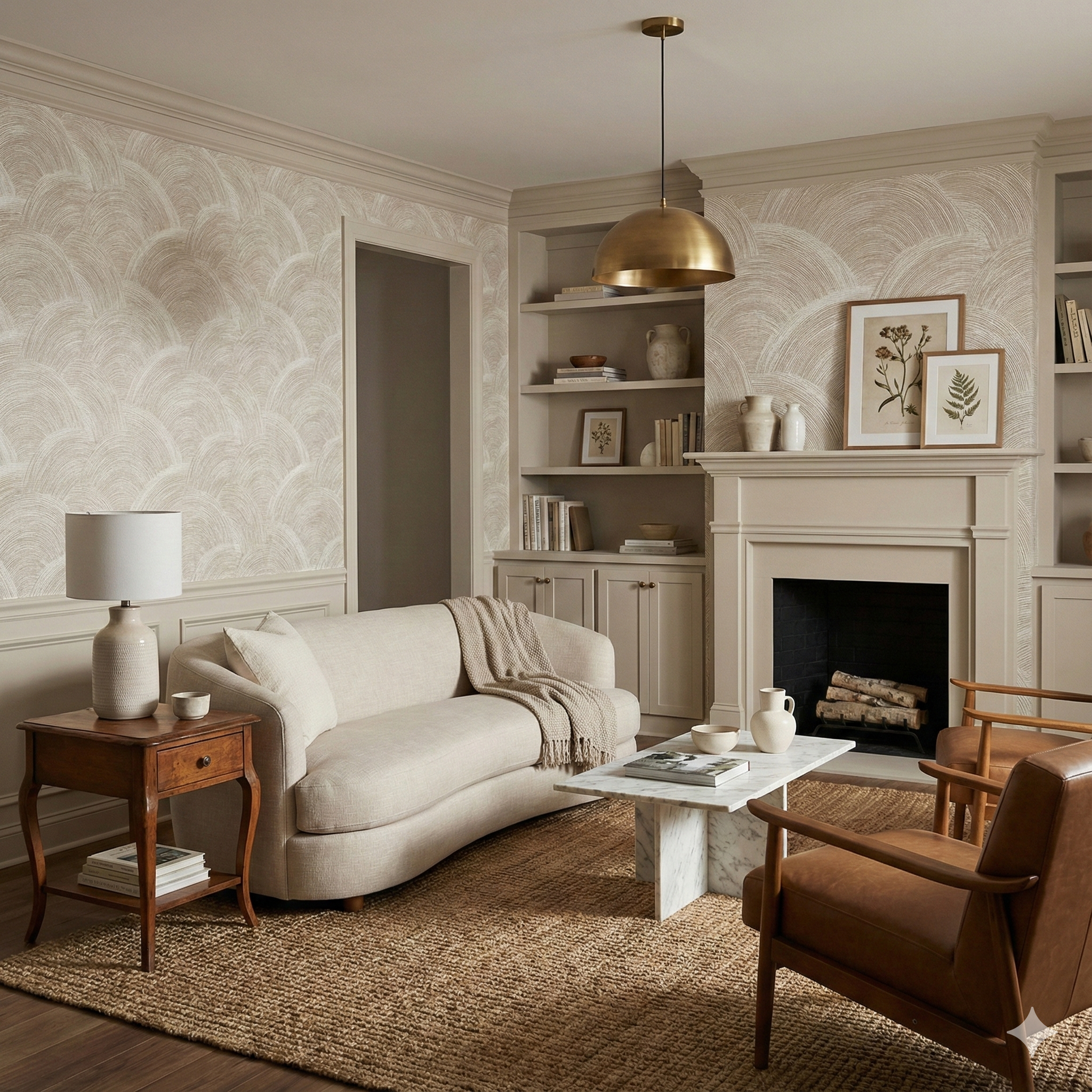 Marbledon Crest is a rhythmic landscape of arching, textured arcs formed from thousands of fine, hand-drawn lines. The design creates a sense of sculpted movement—almost like carved sandstone, woven reeds, or the layered ridges of traditional Japanese seigaiha motifs, but softened into a contemporary neutral palette of cream, oat, tan, and soft ivory. The texture feels tactile even though the surface remains smooth. This pattern thrives in serene, high-end environments: spa bathrooms, transitional entryways, organic modern living rooms, or bedrooms where subtle pattern is used in place of loud décor. It pairs effortlessly with plaster walls, pale woods, boucle upholstery, minimalist ceramics, and neutral linens.