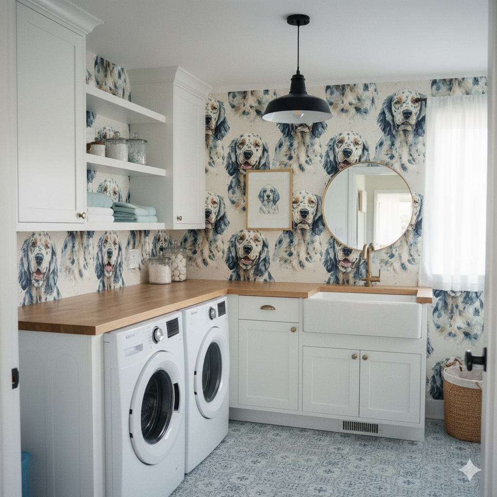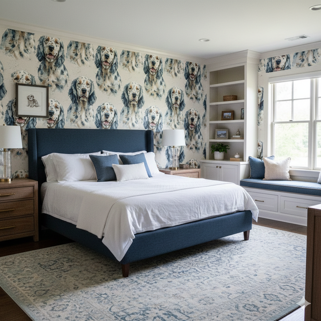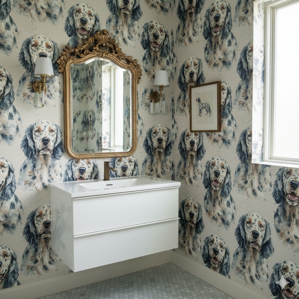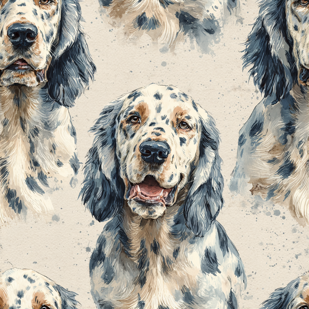Mariner’s Field evokes windswept moors and watercolor skies, its English Setters painted with delicate realism in soft gray-blues, ivory, and honeyed taupe. Subtle ink splashes lend movement and spontaneity, as if each portrait were brushed on handmade paper. The composition feels serene yet storied, perfect for sunlit dining rooms, countryside cottages, or airy coastal homes. Mariner’s Field captures the poetic intersection of nature, loyalty, and landscape — where memory settles like mist over morning fields.