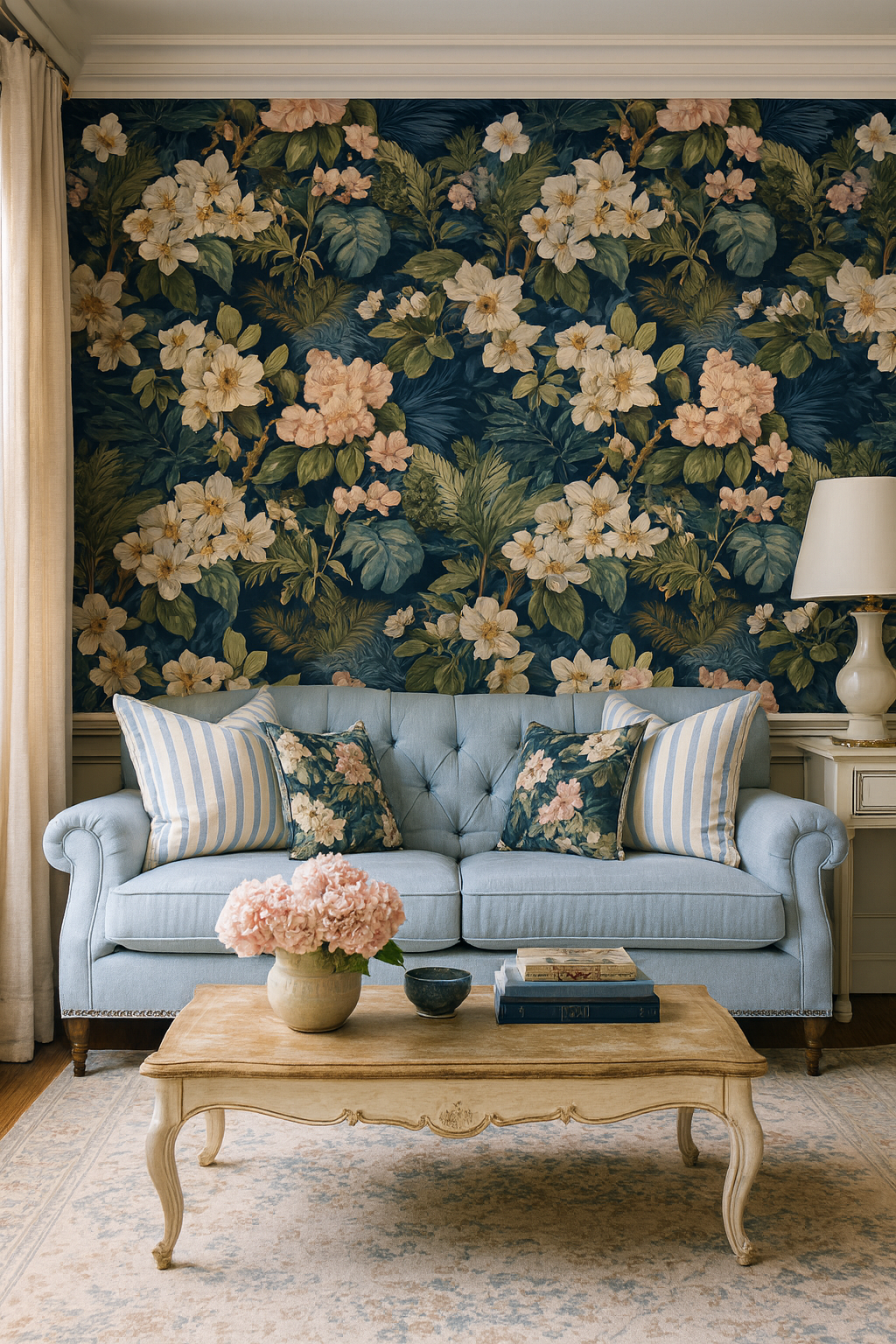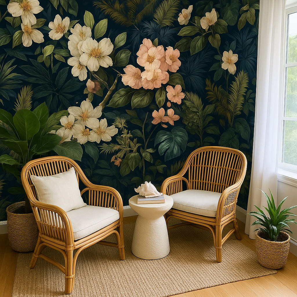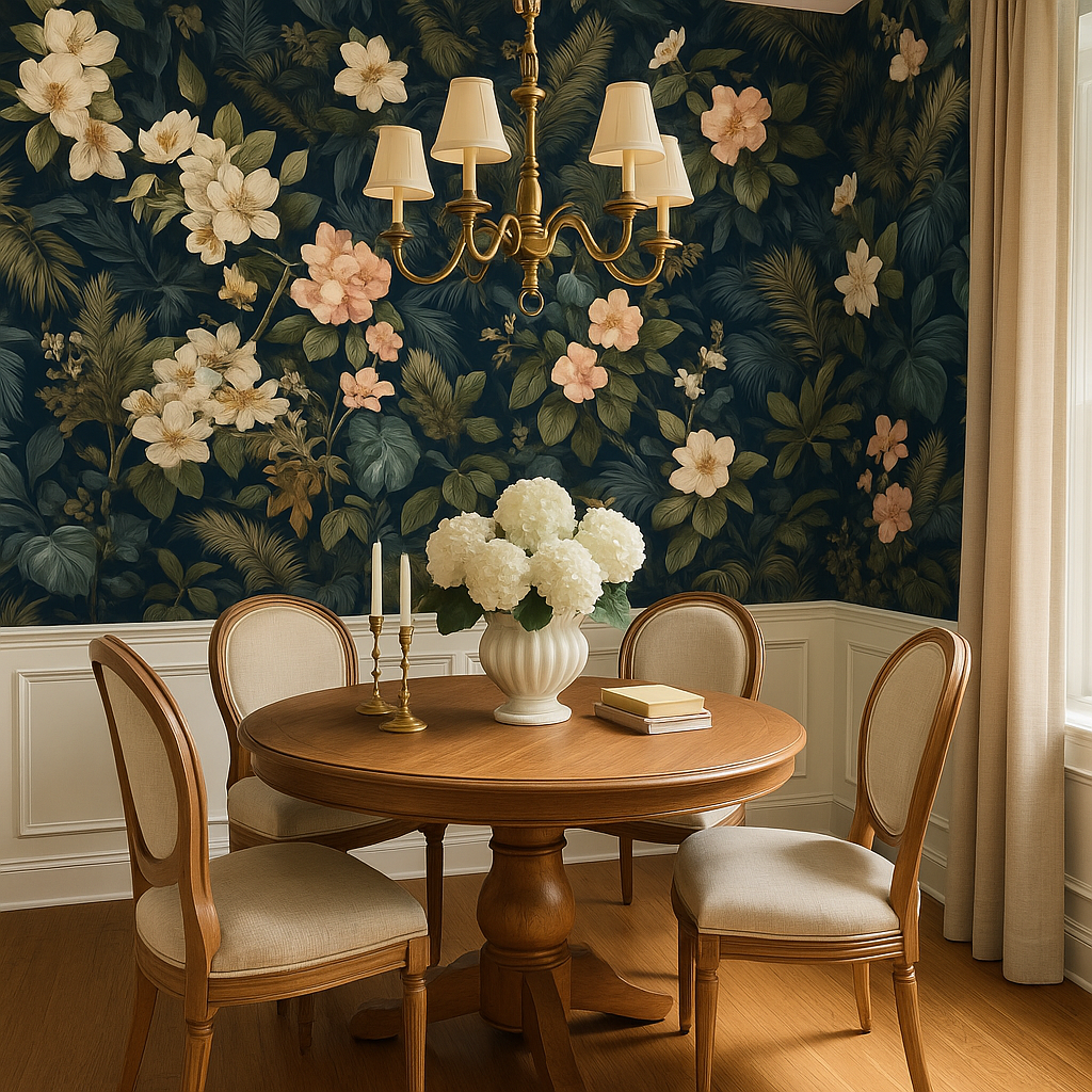 This moody botanical print sets a dramatic stage with its deep navy base and detailed floral bursts in ivory, blush, and sage. Midnight Bloom captures the allure of evening blossoms in a lush forest, with layered foliage and painterly textures. Ideal for dark-academic living rooms, dramatic dining spaces, or boutique powder rooms where ambiance matters.