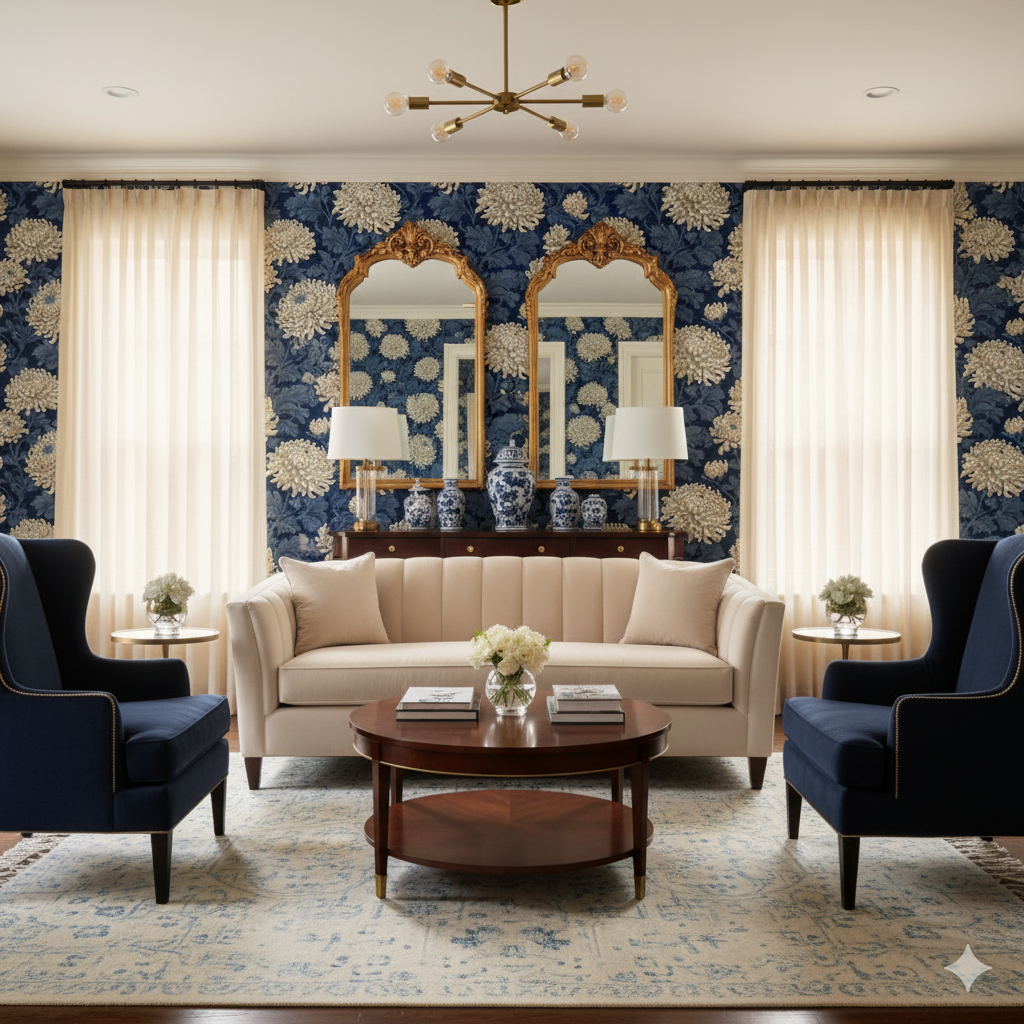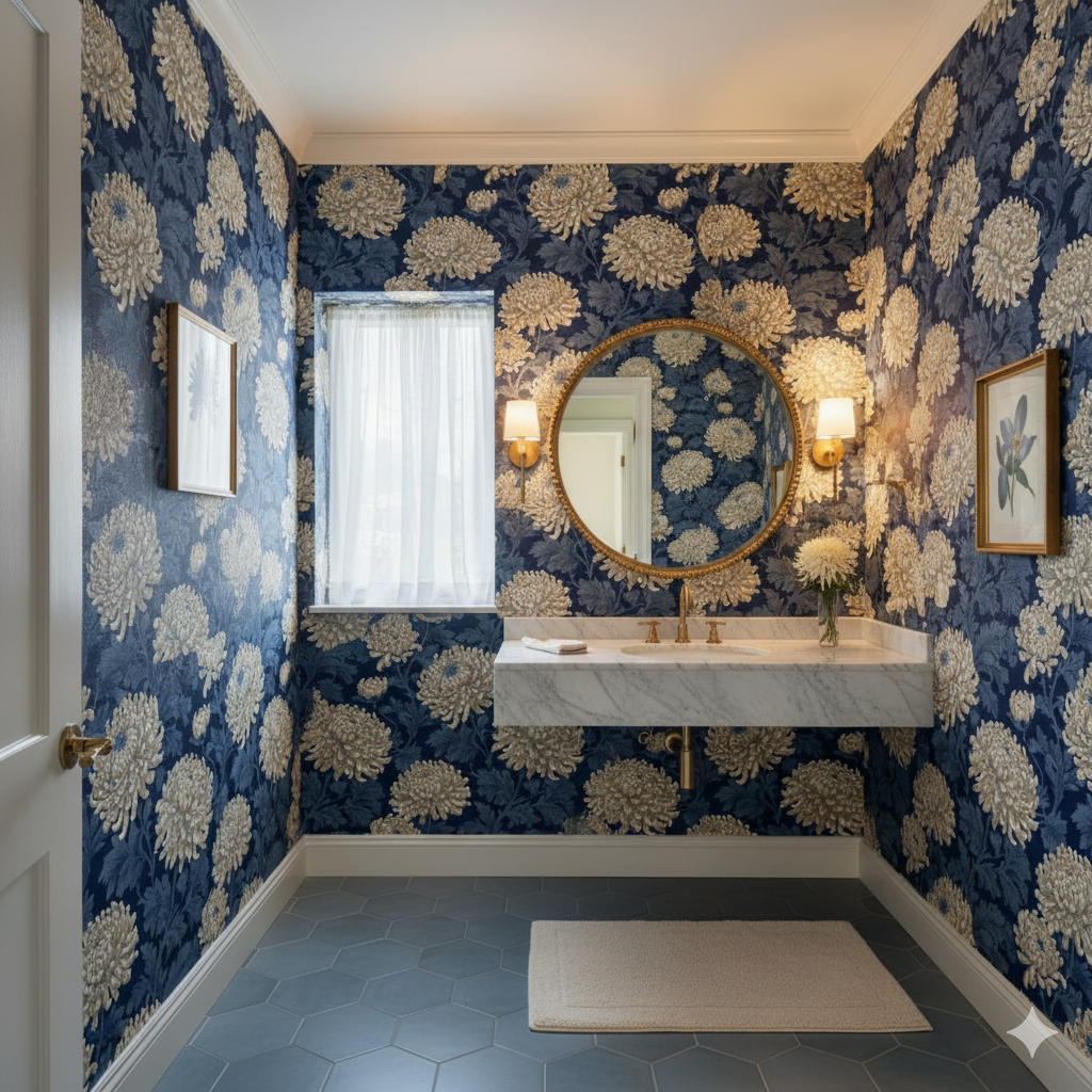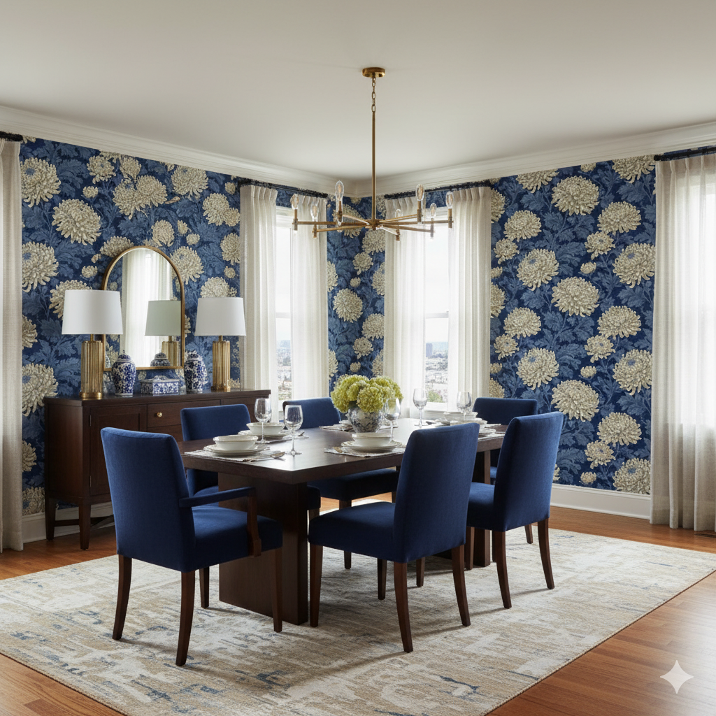 Large ivory chrysanthemum blooms unfurl against a deep indigo background, creating a dramatic yet timeless floral pattern. The intricate detailing of petals and leaves captures traditional botanical illustration, while the rich navy base adds bold sophistication. This design is ideal for dining rooms, elegant parlors, or boutique spaces where you want to merge luxury and heritage style.