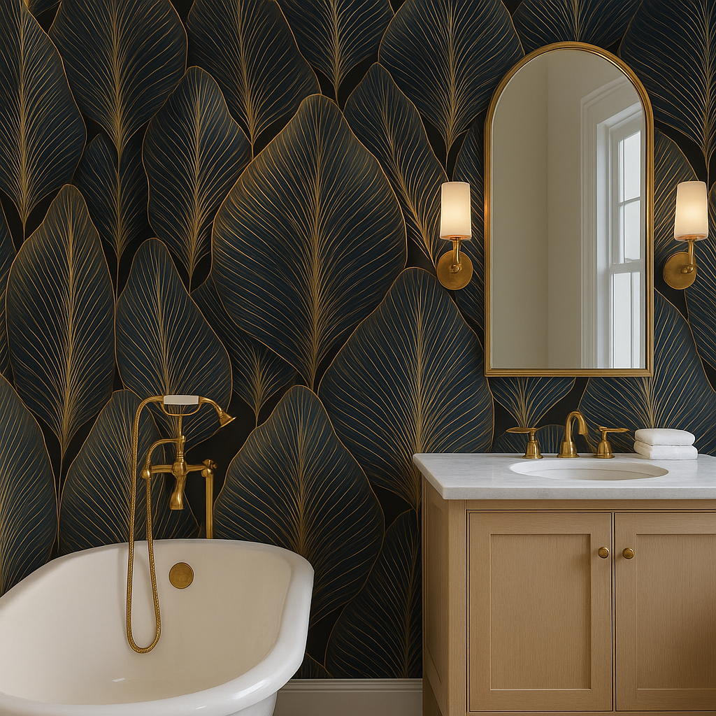 Midnight Frond is a sultry dance of golden botanicals on a deep indigo stage. Tall tropical fronds stretch upward like flames, each rendered with exquisite linework and glowing accents that shimmer subtly across the surface. This wallpaper blends art deco elegance with rainforest mystique, creating a luxurious mood for dining rooms, home bars, or dramatic entryways. Think dark glamour, slow jazz, and rooms that smolder long after sunset.