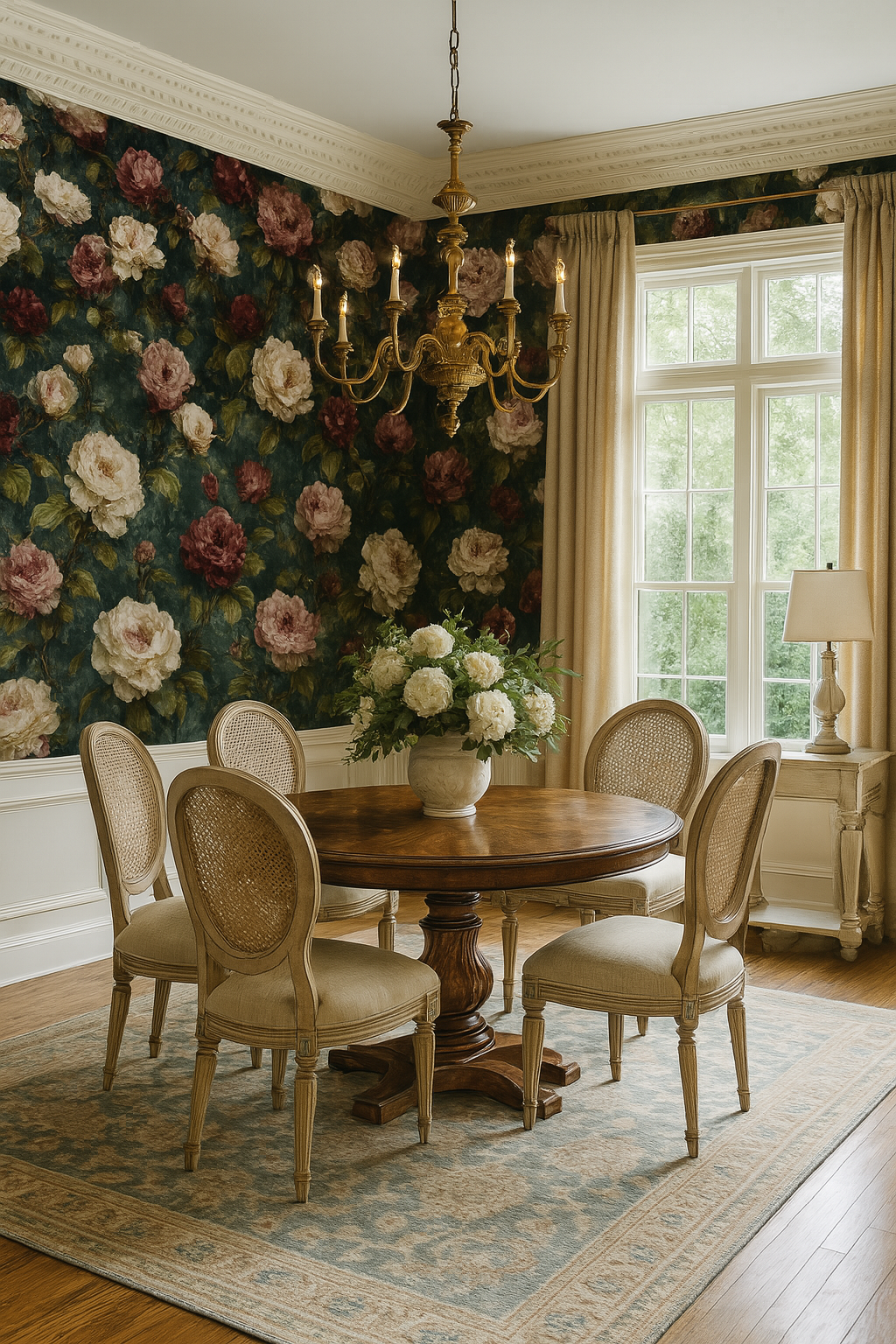 Oversized oil-painted roses bloom in rich mauve, blush, and cream against a dark, moody teal backdrop in this romantic floral wallpaper. The painterly brushstrokes evoke classical still-life paintings, ideal for creating an opulent vintage vibe in powder rooms or dramatic entryways. A must-have for lovers of dark floral wallpaper, cottagecore romance, or Victorian-style home décor.
