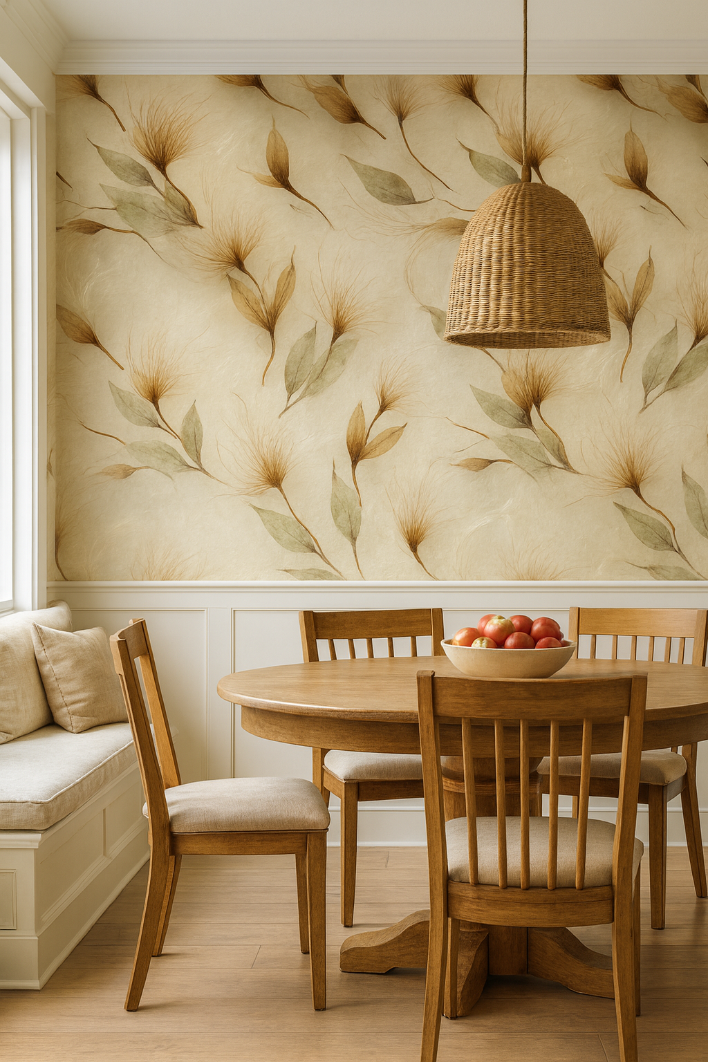 Whimsical and airy, "Milkweed Drift" captures the magic of wispy seed pods as they spiral and float gently across a parchment-hued surface. Delicate filaments and pale botanical elements bring a soft, dreamlike quality to this design, perfect for serene nurseries, bohemian bedrooms, or nature-inspired meditation spaces. This botanical wallpaper is light, graceful, and ephemeral.
