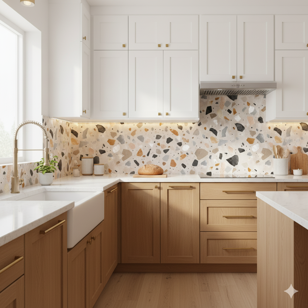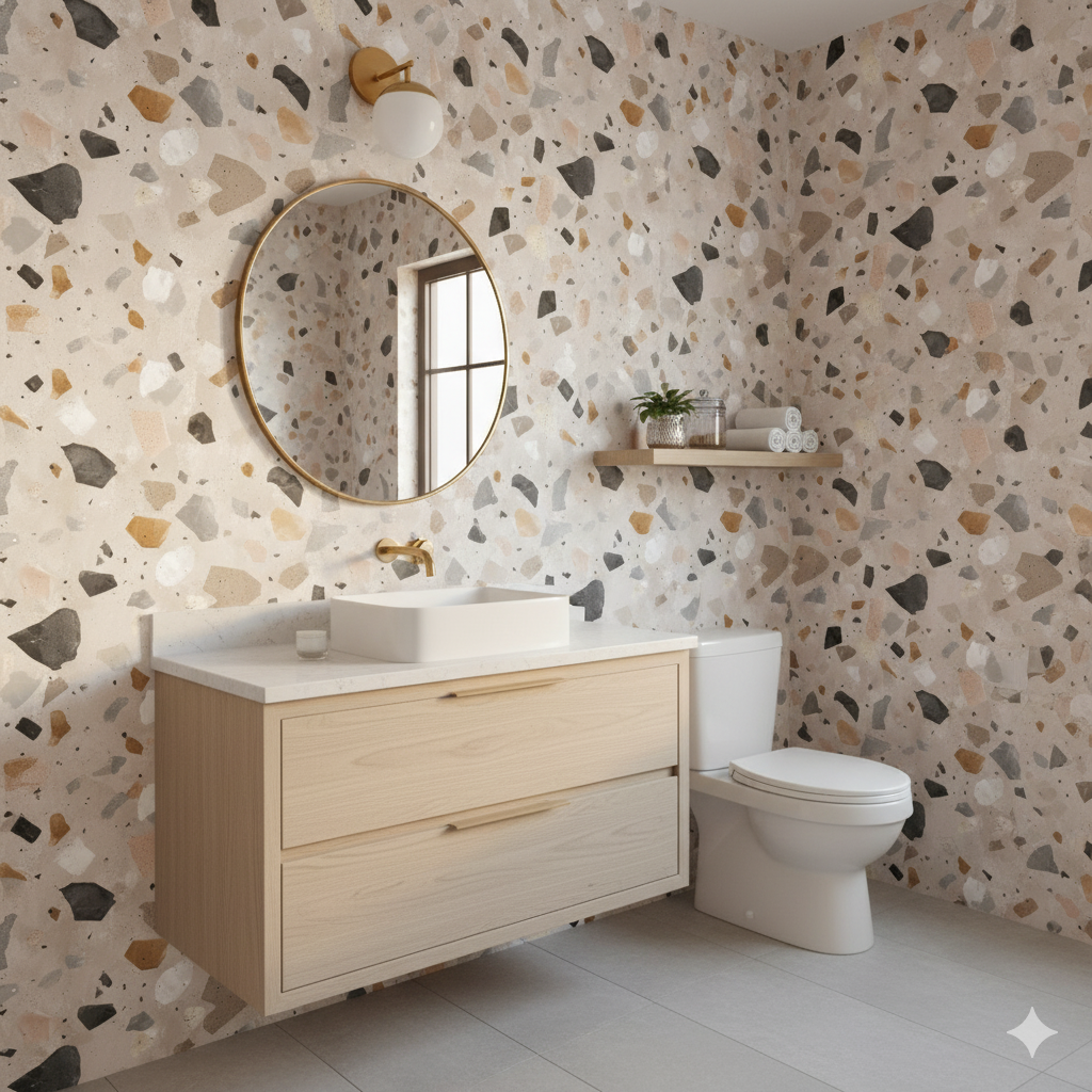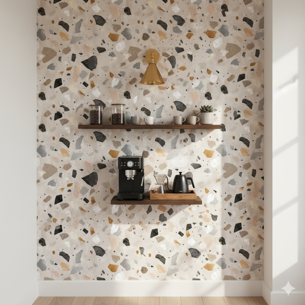 Terrazzo fragments in earthy caramel, ivory, slate gray, blush, and smoky black scatter across a pale stone background. The scale of the chips feels natural, reminiscent of traditional poured terrazzo but given a contemporary, more graphic clarity. It works beautifully in kitchens, bathrooms, and mudrooms but also has enough softness for modern dining rooms or casual entryways. Its versatility lies in the balance of organic randomness with clean repetition, making it an easy pairing with white cabinetry, stone counters, or matte black fixtures.