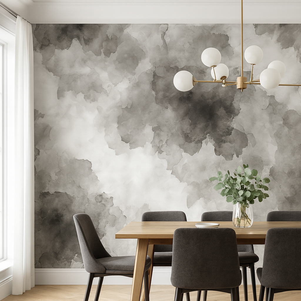A calming grayscale inkblot pattern that evokes the symmetry of a Rorschach test with soft, blurred edges. This neutral wallpaper adds psychological intrigue and modern calm, perfect for moody powder rooms or minimalist home offices seeking abstract depth. Black and white abstract wallpaper meets artistic expression.