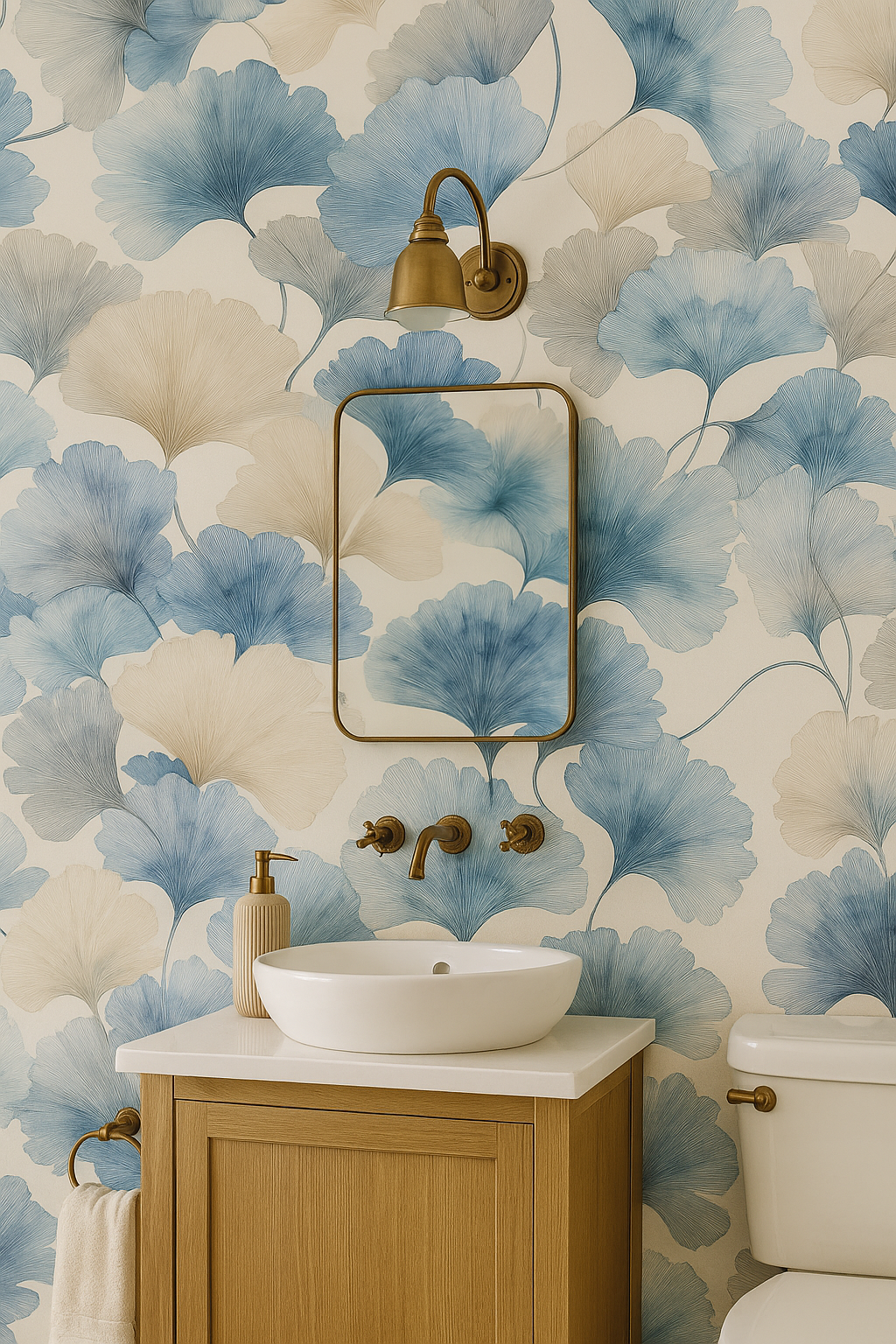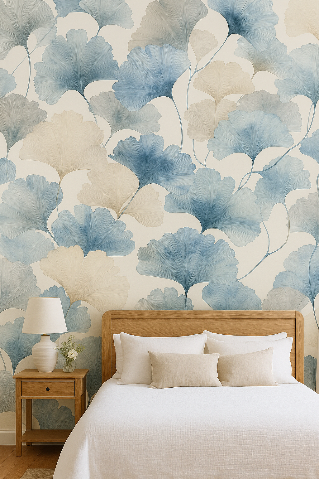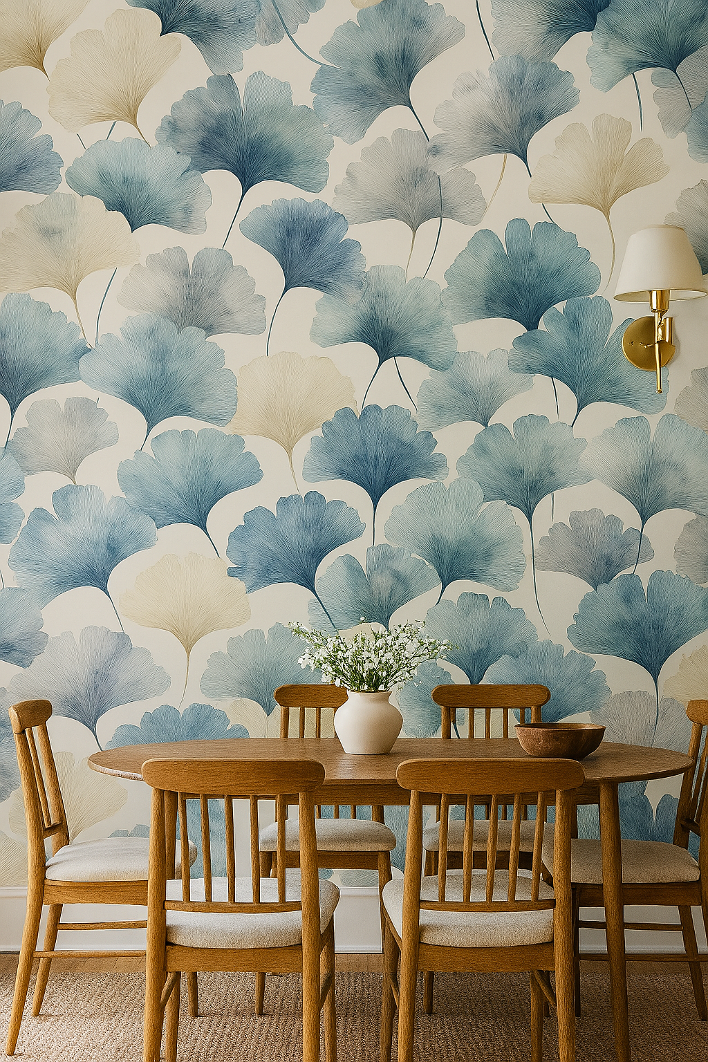 Dreamlike and delicate, Mistleaf Whisper captures ginkgo leaves caught mid-drift on a breeze. Rendered in washed gradients of cloud white, sky blue, and powder gray, the watercolor-like forms float across a clean canvas with ethereal rhythm. This wallpaper is made for spa-style spaces, calm bedrooms, or minimalist interiors craving just a touch of movement and life. Gentle, balanced, and beautifully airy—like breathing with your eyes.