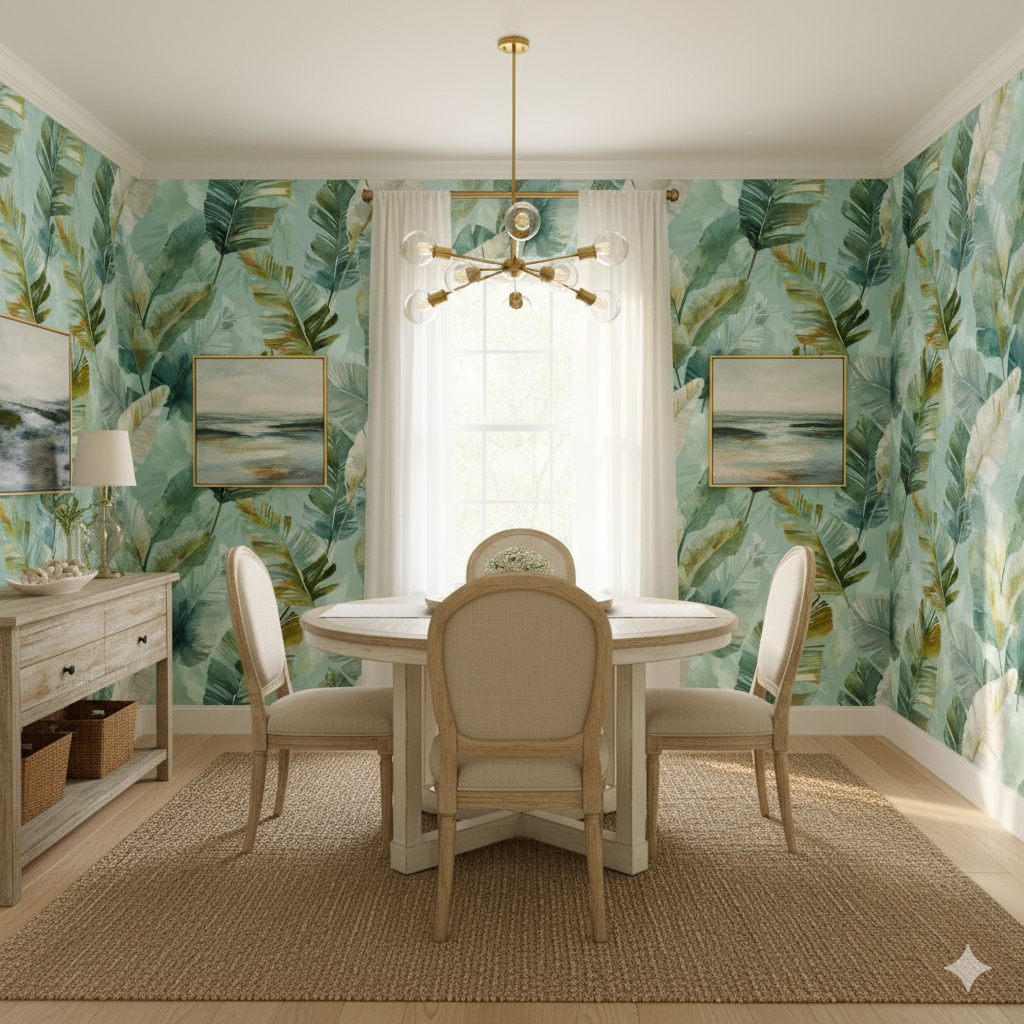 This lush watercolor design evokes the airy grandeur of a tropical conservatory, where towering banana leaves overlap in translucent layers of green, teal, and sage. Gentle washes of golden ochre soften the edges, bringing warmth and movement as though caught in a coastal breeze. Monteverde feels light and expansive, perfect for a sunroom, coastal retreat, or even a modern dining space where natural light enhances its fresh palette. Its layered leaves carry both vibrancy and calm, balancing botanical detail with painterly abstraction. Ideal for spaces seeking that balance of exotic vibrancy and spa-like tranquility.
