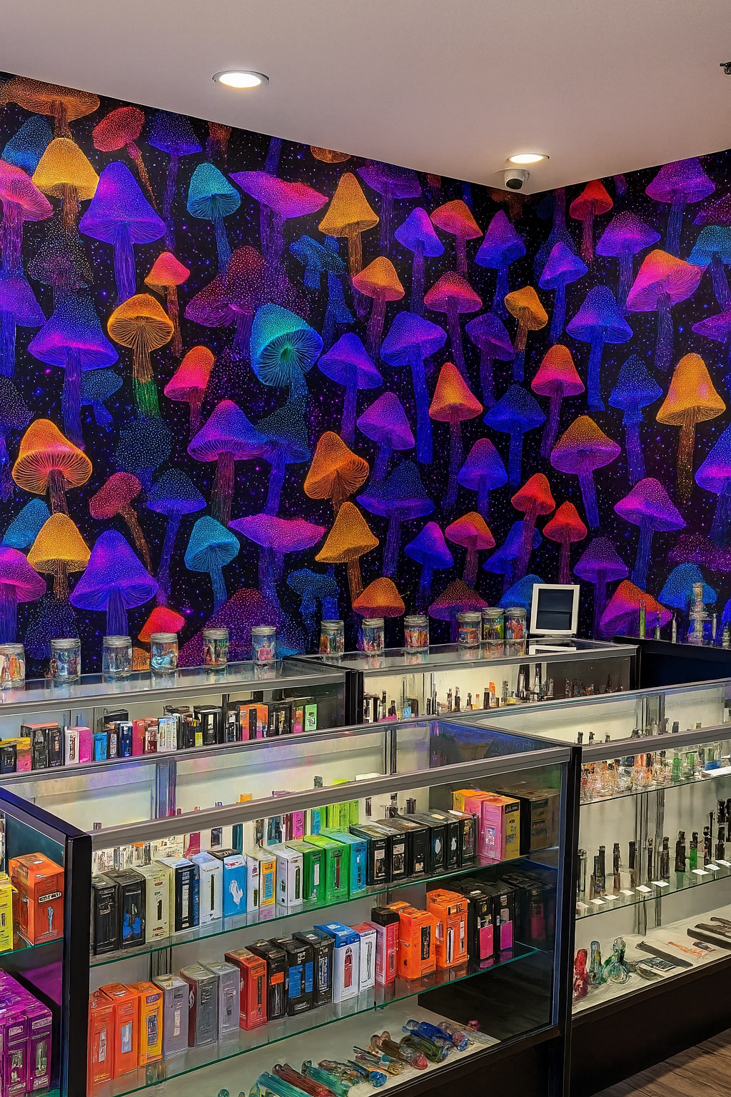 A psychedelic dreamscape, Mycobliss bursts with oversized neon mushrooms in glowing shades of magenta, cyan, orange, and ultraviolet, all set against a cosmic black background sprinkled with radiant stars. Ideal for boho bedrooms, festival lounges, kids’ creative zones, or retail displays looking to capture a vibrant, trippy vibe.