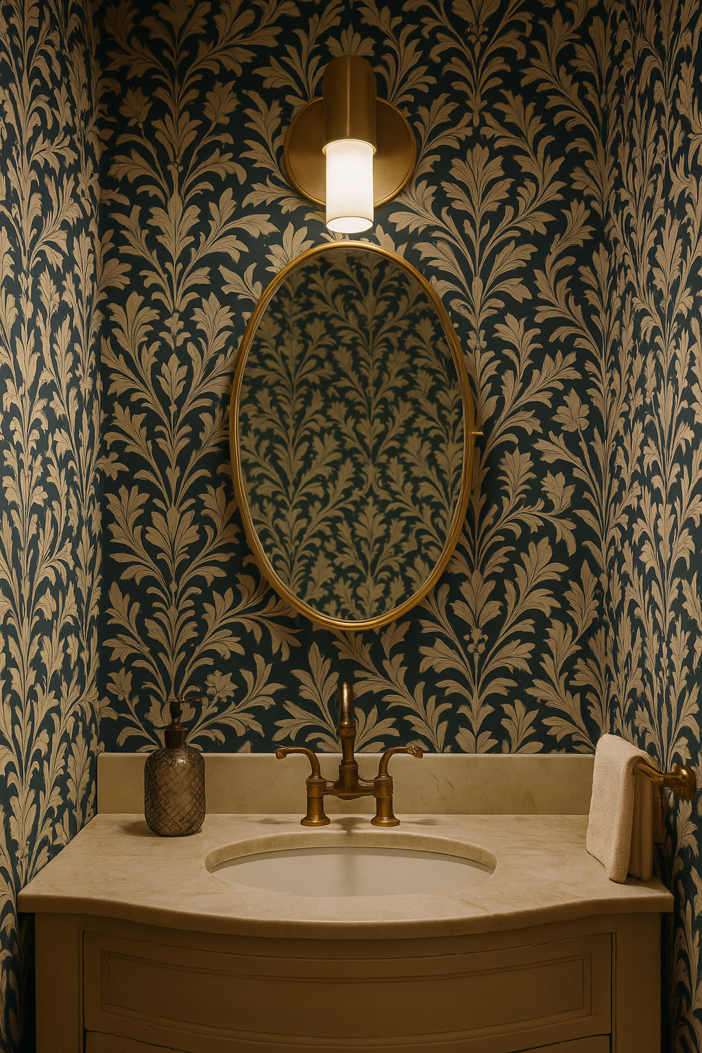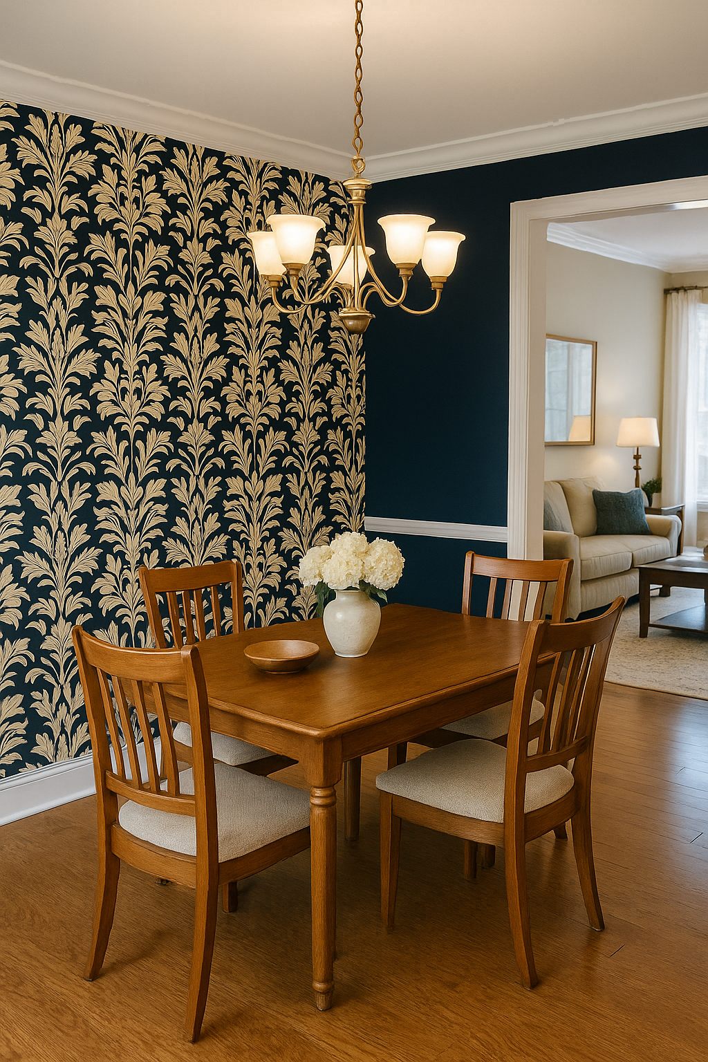 A nod to old-world elegance, Noble Laurel reimagines the classic damask motif with a soft golden flourish atop a deep navy ground. The intricate repeat feels regal yet inviting, blending historic charm with clean symmetry. Ideal for formal dining rooms, boutique hotel-inspired bedrooms, or traditional spaces needing texture and polish, this wallpaper brings heritage into the now. Pair it with velvet, wainscoting, or dramatic lighting for a luxe, layered interior that’s timeless without feeling stuffy.