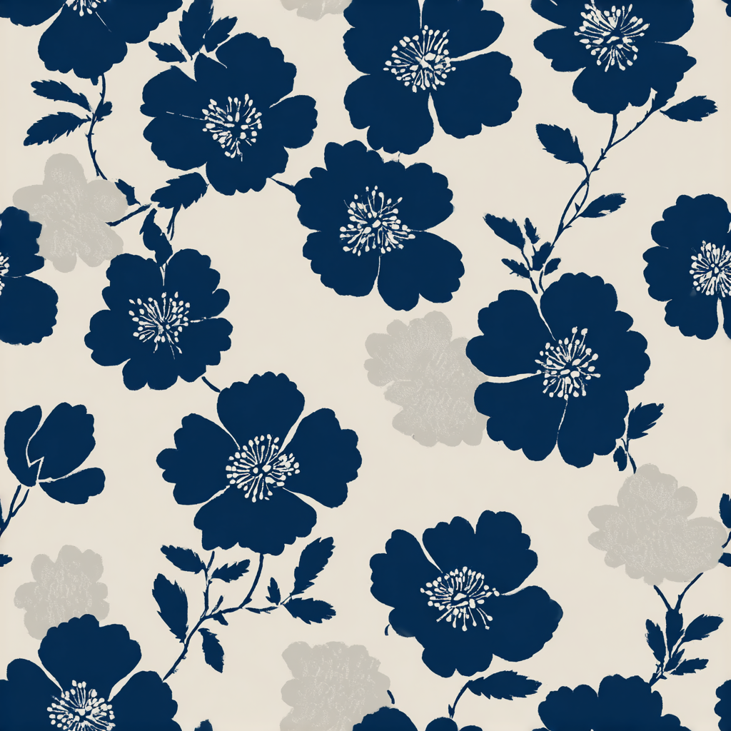 Deep navy petals bloom in confident silhouettes across a soft cream ground, accented by faint gray overlays. Noctis Bloom is bold but balanced, distilling floral motifs into something graphic and timeless. Its high-contrast simplicity feels at home in contemporary apartments or boutique spaces seeking drama without clutter. The interplay of matte indigo and light neutrality adds a quiet refinement that commands attention effortlessly.