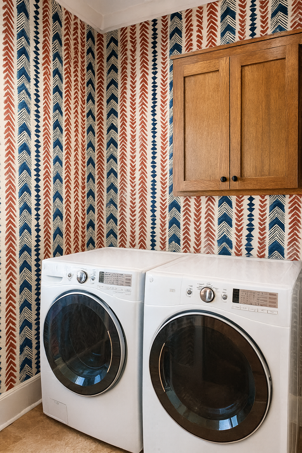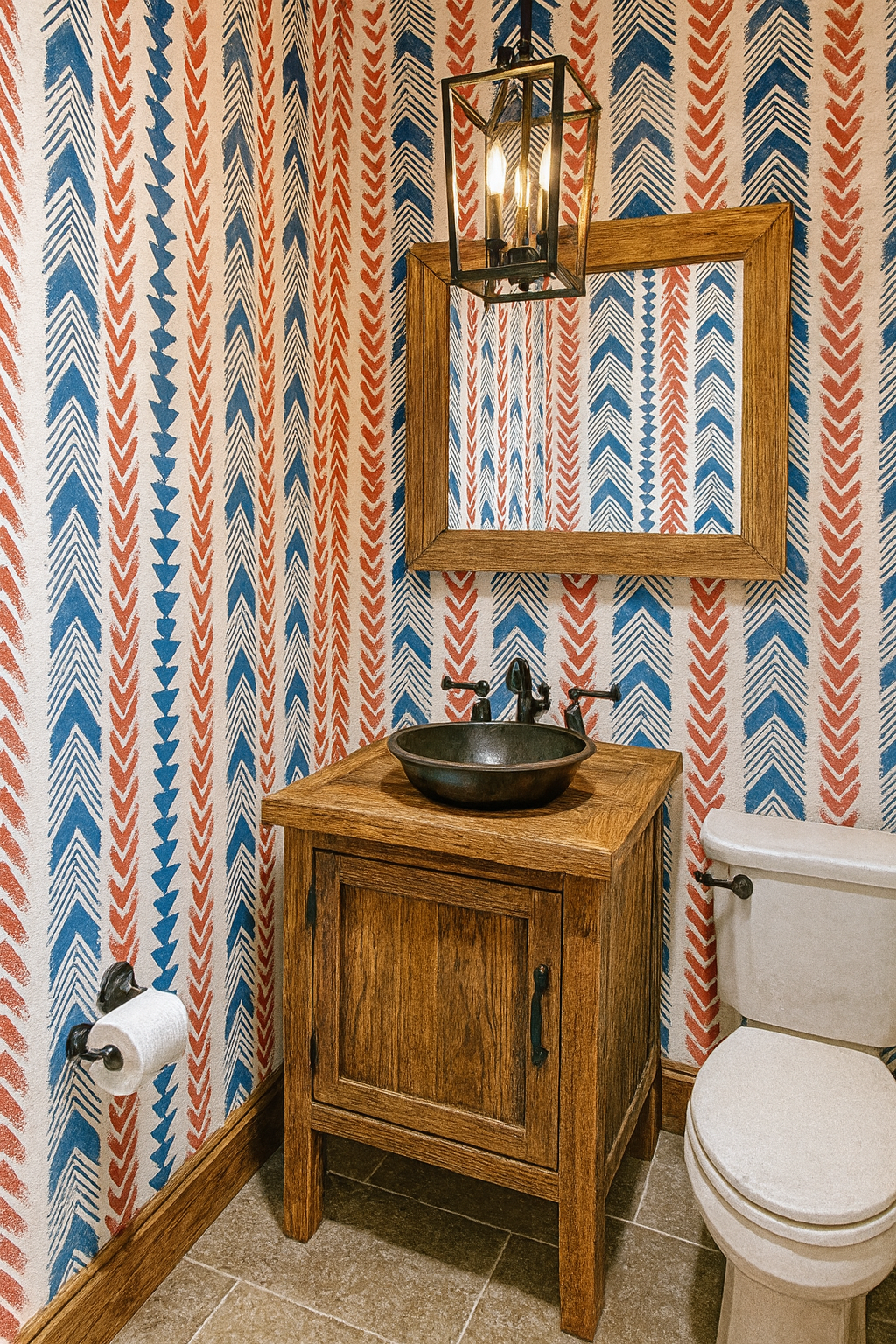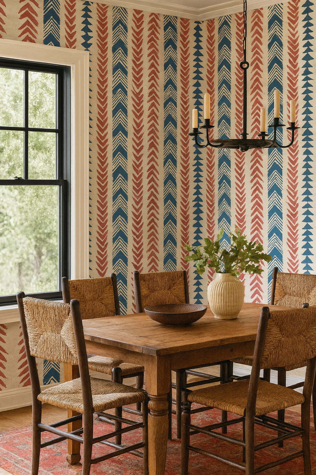 Nomad’s Chevron Chant celebrates bold rhythm and tribal energy through rows of hand-printed chevrons, arrows, and geometric stripes in barn red, indigo blue, and sand. With its textured stamp-like feel and directional flow, this pattern fits perfectly in bohemian dens, creative studios, or travel-inspired living spaces craving structure with soul.