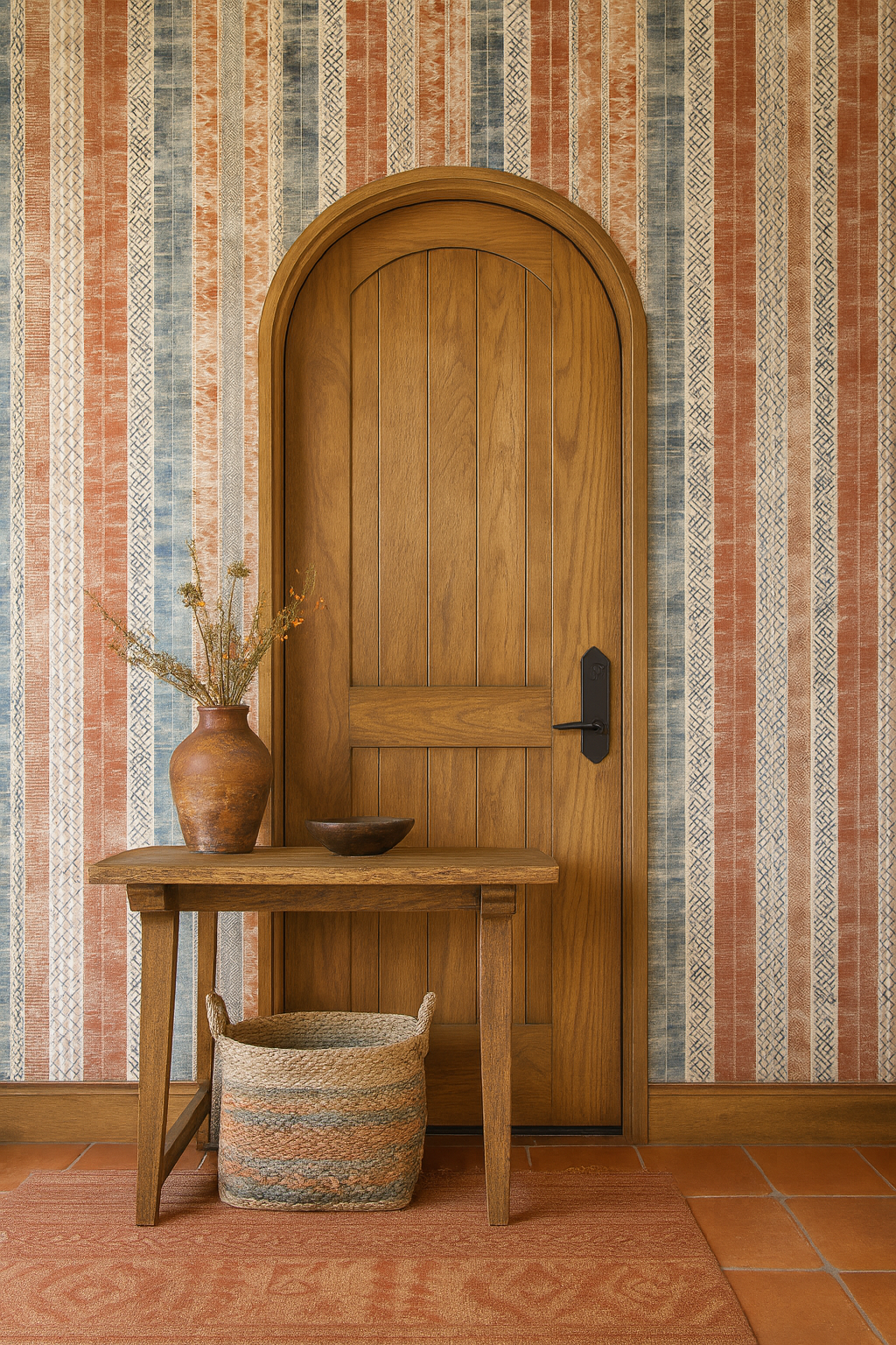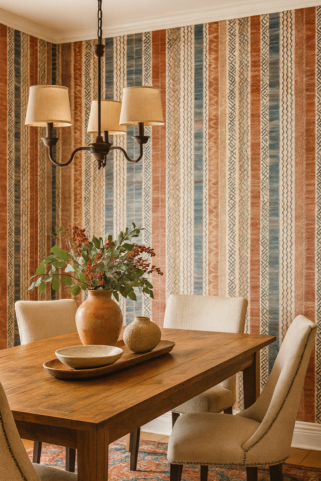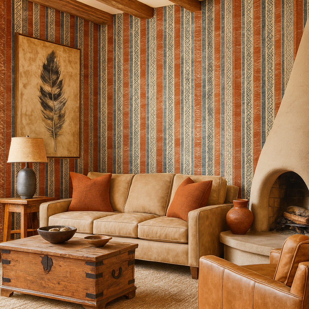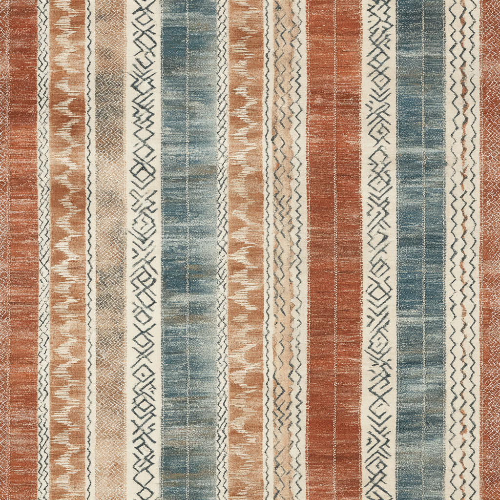 Channeling vintage woven kilims and global textiles, this richly patterned vertical stripe design weaves burnt sienna, dusty turquoise, and clay tones with tribal-style motifs. Each stripe carries its own cultural whisper—perfect for Southwest-inspired bedrooms, eclectic hallways, or a moody lounge with warm wood and leather. Rustic yet refined, it’s a visual diary of faraway lands.
