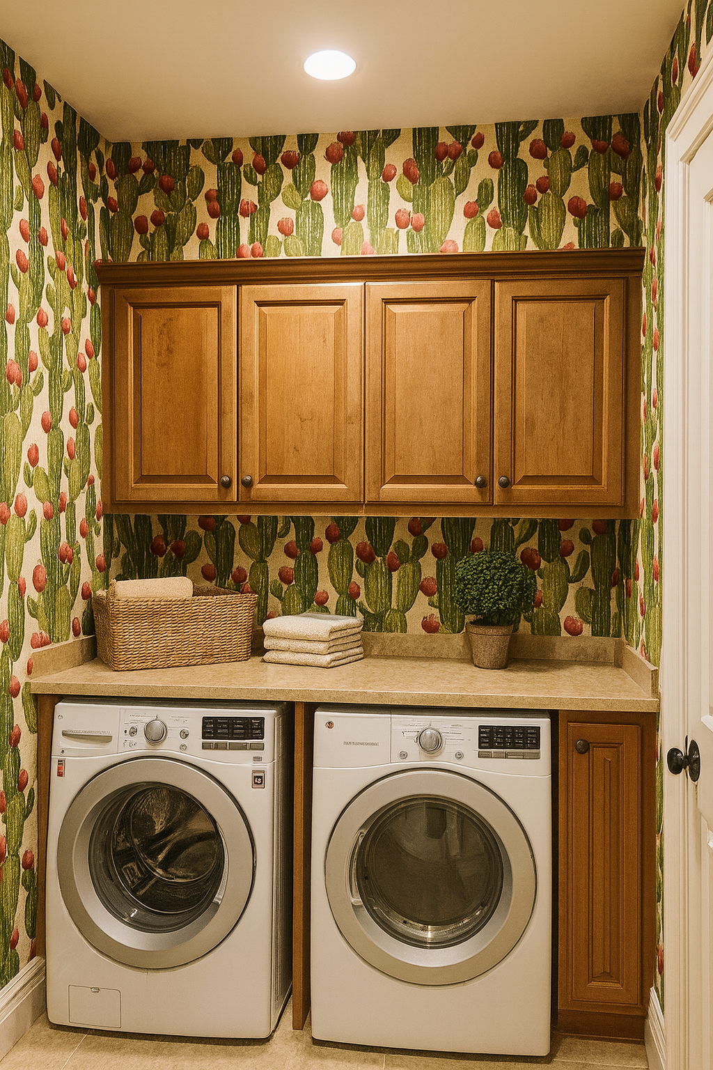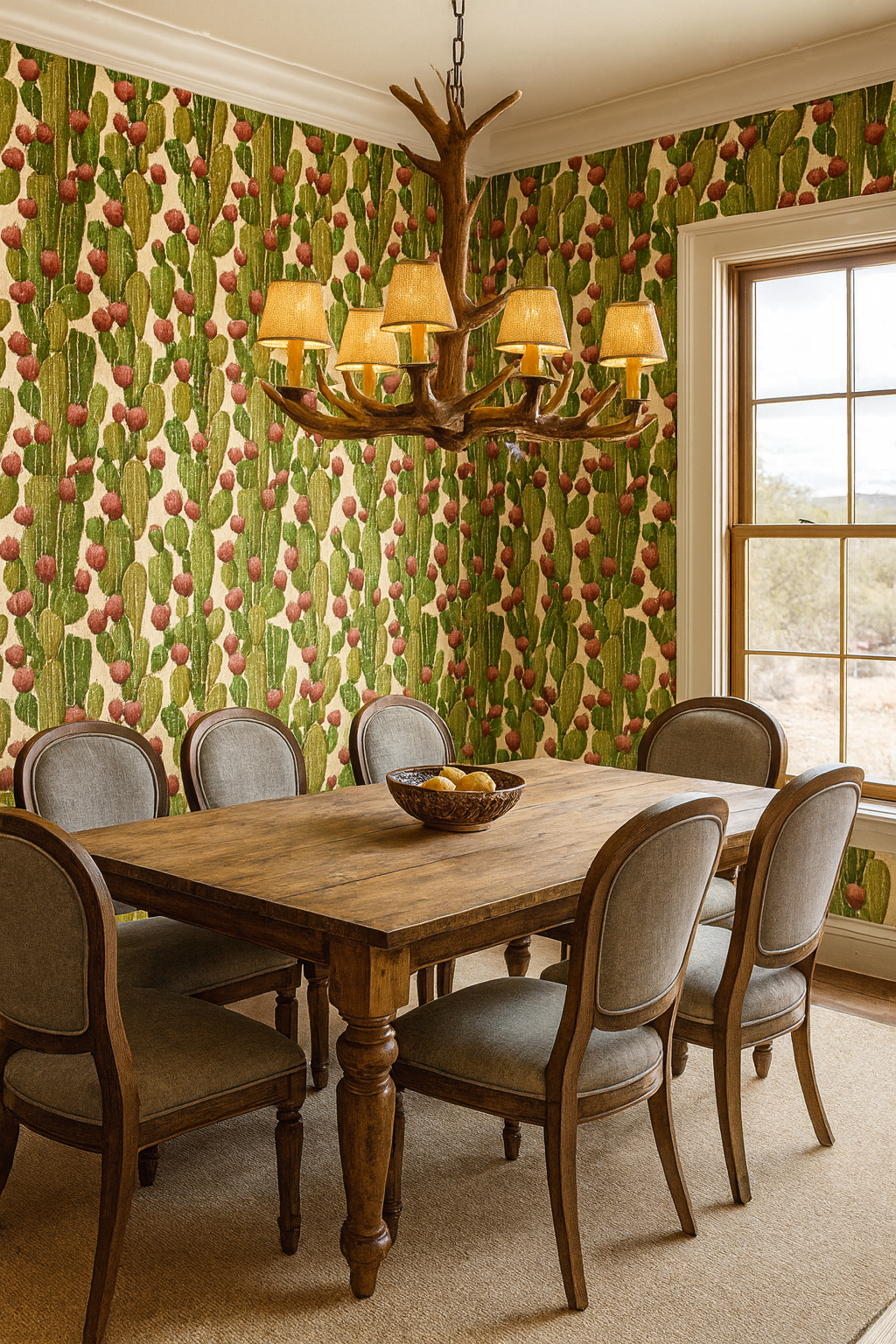 Nopal Rhapsody captures vertical towers of prickly pear cacti, their olive and sage pads crowned with juicy magenta fruits. With a hand-painted effect on a canvas-like backdrop, this pattern evokes desert landscapes with botanical sophistication. Ideal for Southwestern kitchens, desert-themed cafes, or boho guest rooms.