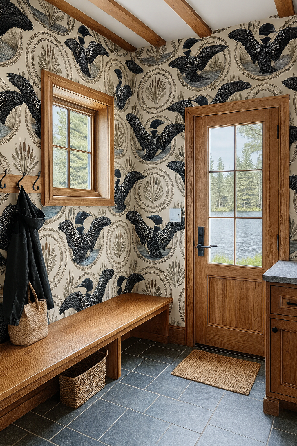 This vintage-inspired wallpaper showcases the elegant common loon in a medallion repeat, with wings spread proudly in a tranquil marsh setting. Framed by ornate oval motifs and flanked by cattails, the design balances nature’s serenity with classical detailing. The muted cream background pairs with jet black, ivory, and sepia tones, making it ideal for a rustic cabin, lakeside retreat, or masculine study. Perfect for anyone wanting to bring Northwoods nostalgia into their space with timeless sophistication.