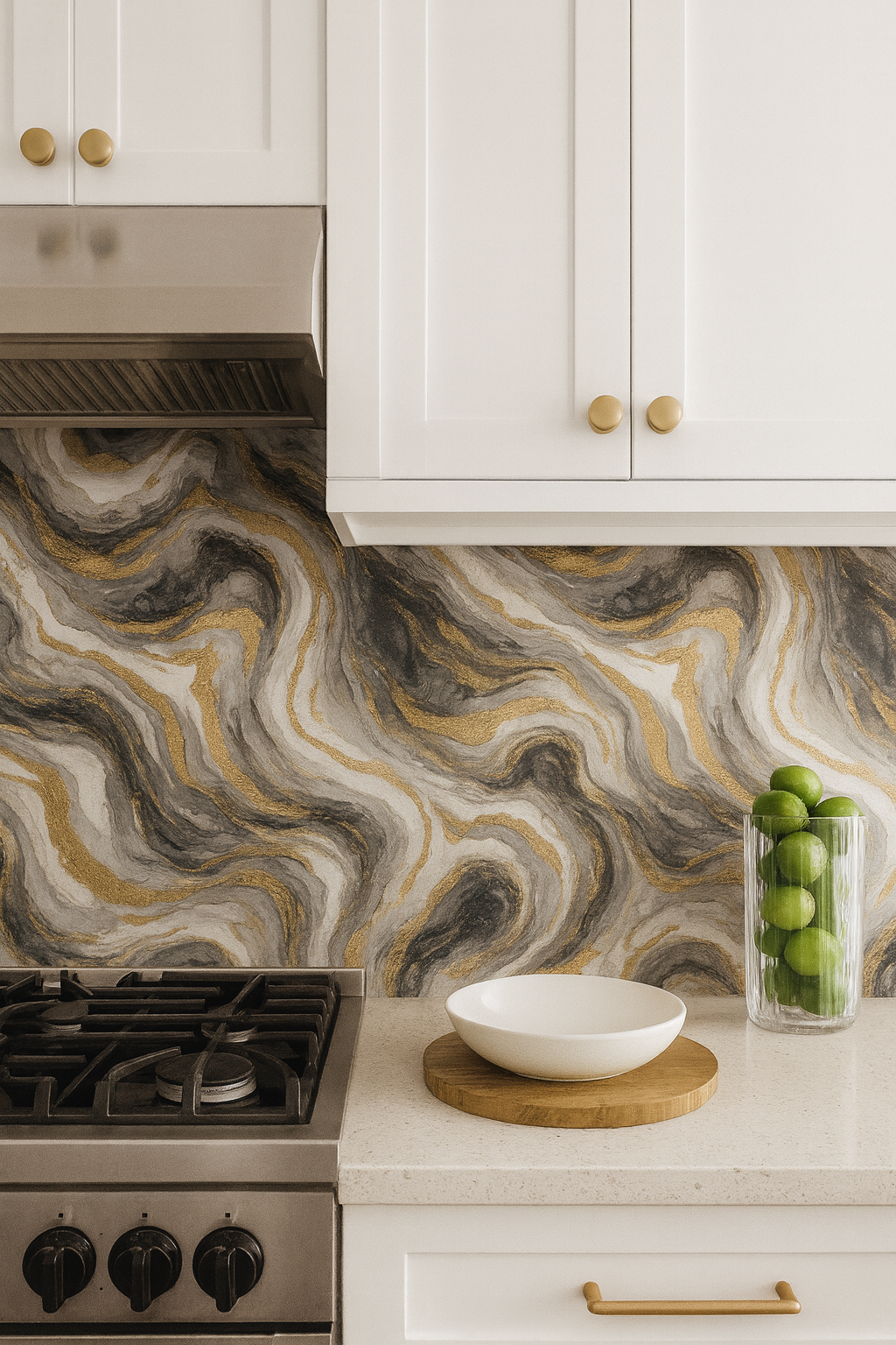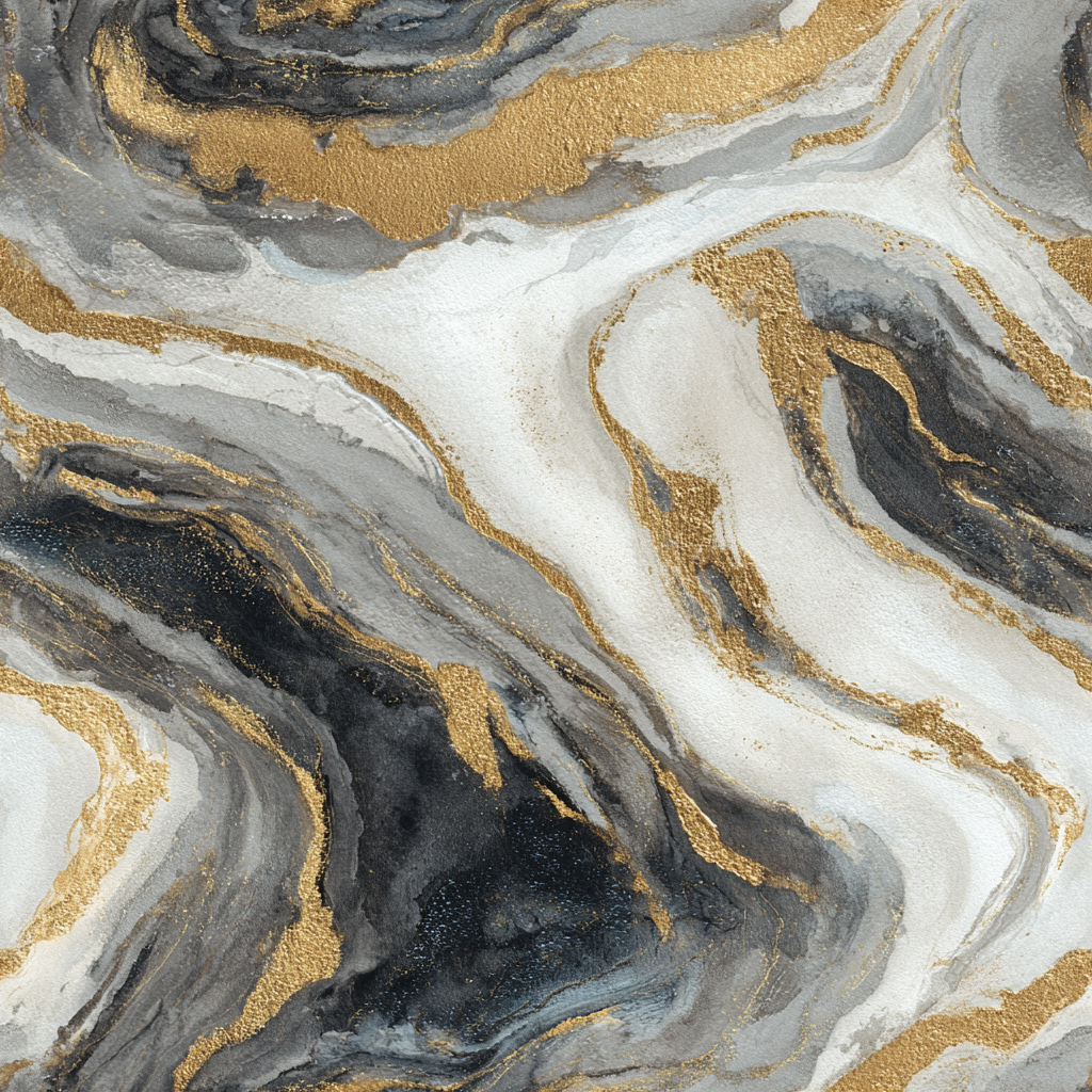 A mesmerizing abstract marble design where inky blacks and rich graphite tones swirl through warm ivory with rivers of molten gold veining, like a volcanic dream frozen in time. The painterly texture evokes a sense of luxury and depth, making this pattern ideal for dramatic, high-impact surfaces.