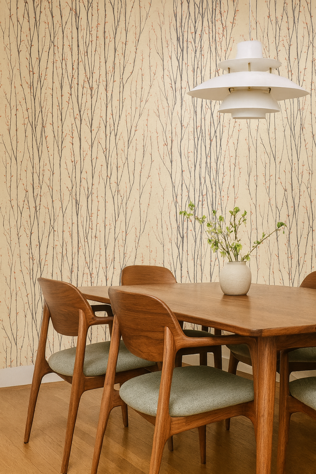Slim, spindly desert ocotillo branches rise in rhythmic verticals in “Ocotillo Whispers.” Set against a warm sand-colored background, the inky-black twigs are dotted with dainty red blossoms, evoking desert minimalism with a touch of whimsy. Ideal for spaces seeking serenity and natural movement—like meditation rooms, reading corners, or minimalist office walls—this wallpaper offers organic sophistication with a botanical edge.