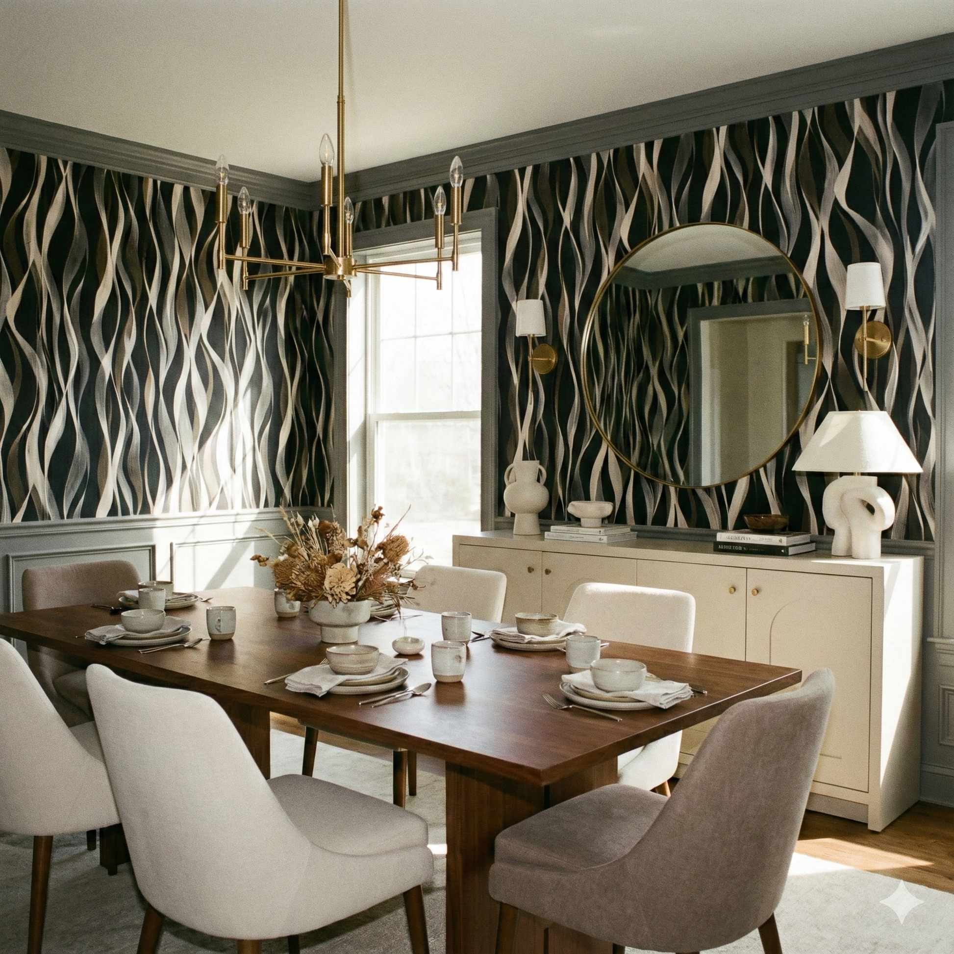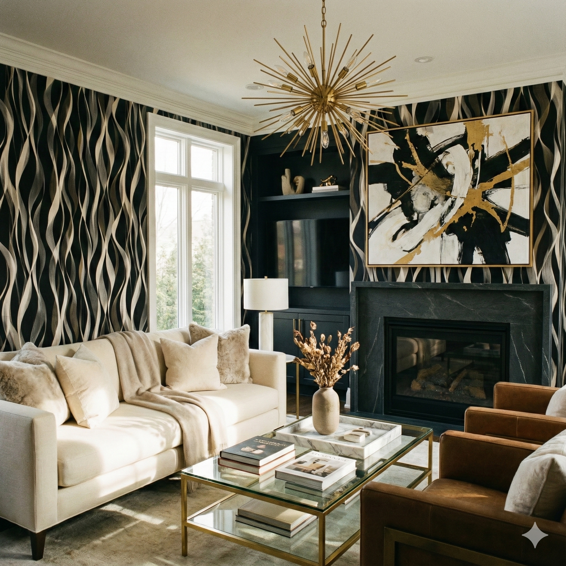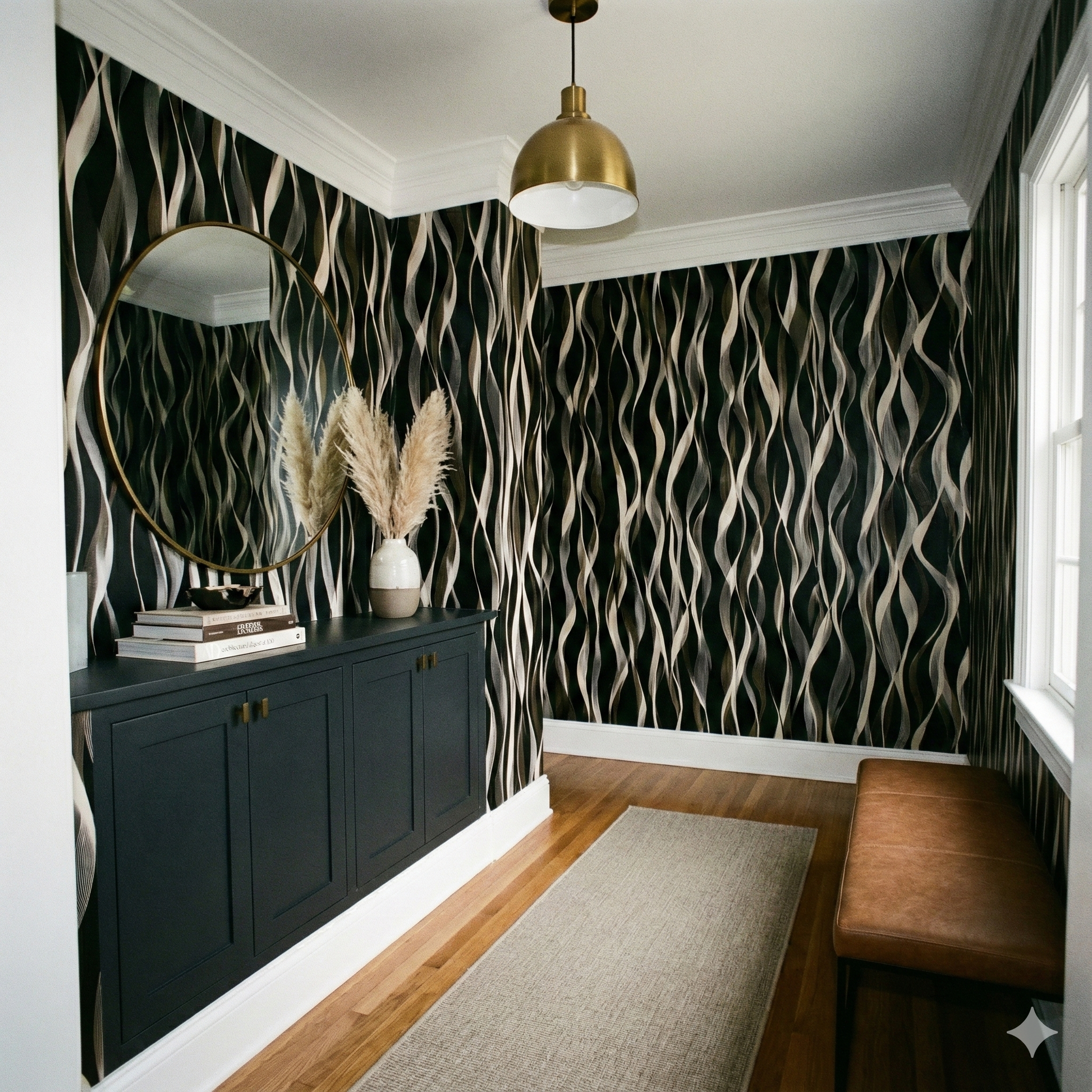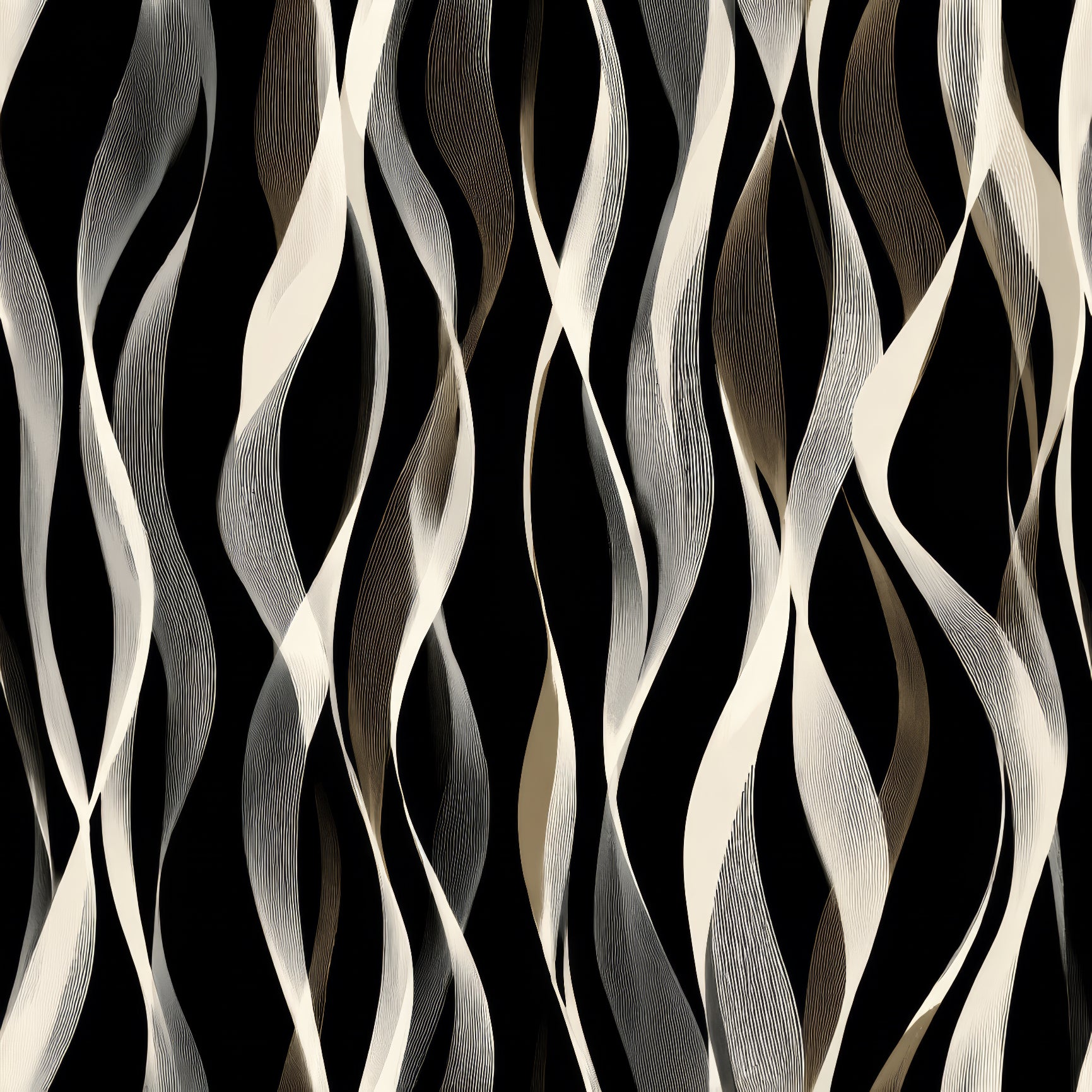 This pattern layers long, ribbon-like curves in platinum, ivory, smoke, and muted bronze over a stark black ground, creating a hypnotic vertical movement reminiscent of sculptural kinetic art. The fine linework gives each strand a dimensional, metallic quality while the overall flow remains fluid and modern. “Opaline Drift” is a statement piece for contemporary homes, high-rise apartments, modern cocktail lounges, and fashion-driven retail interiors. Its rhythm and movement give height to shorter walls and create instant drama in minimalist spaces that crave sophisticated ornament without clutter.