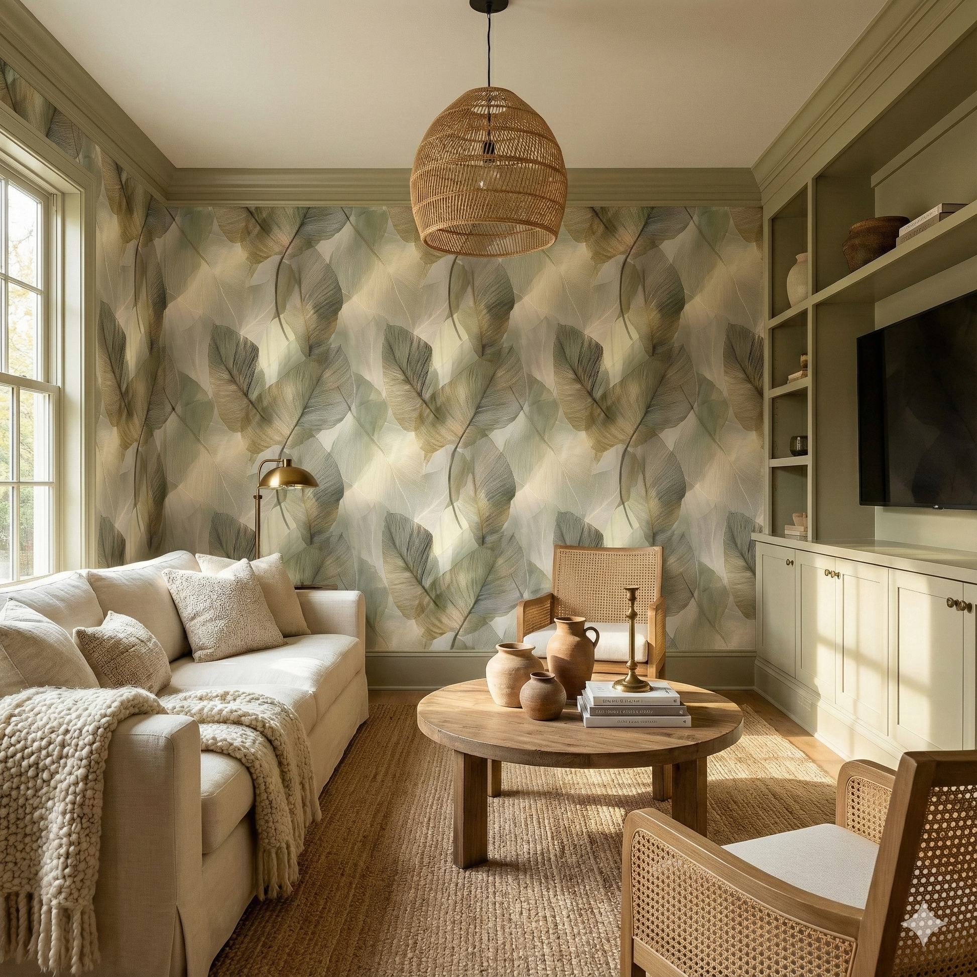 Opaline Leaffall is an ethereal study of banana leaves rendered as translucent veils of line and shadow. Overlapping fronds in soft taupe, olive-grey, champagne, and subtle smoke hues drift across the wall, their fine ribbing etched like ink drawn through mist. The semi-sheer layering creates a sense of depth and gentle movement, as if the leaves are suspended in filtered light. The palette is intentionally neutral and sophisticated, making this design ideal for large-scale installations where you want atmosphere rather than a bold graphic statement. It is particularly suited to bedrooms, hotel-inspired suites, serene living rooms, and contemporary entryways where soft, organic forms complement stone, linen, light woods, and brushed metals. Opaline Leaffall works beautifully with both minimalist and luxe interiors, acting as an elegant backdrop that feels airy, calming, and quietly dramatic.