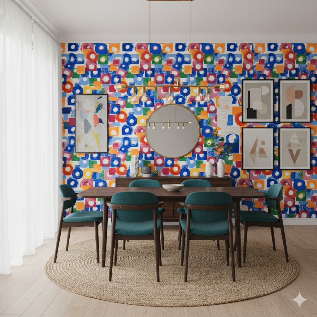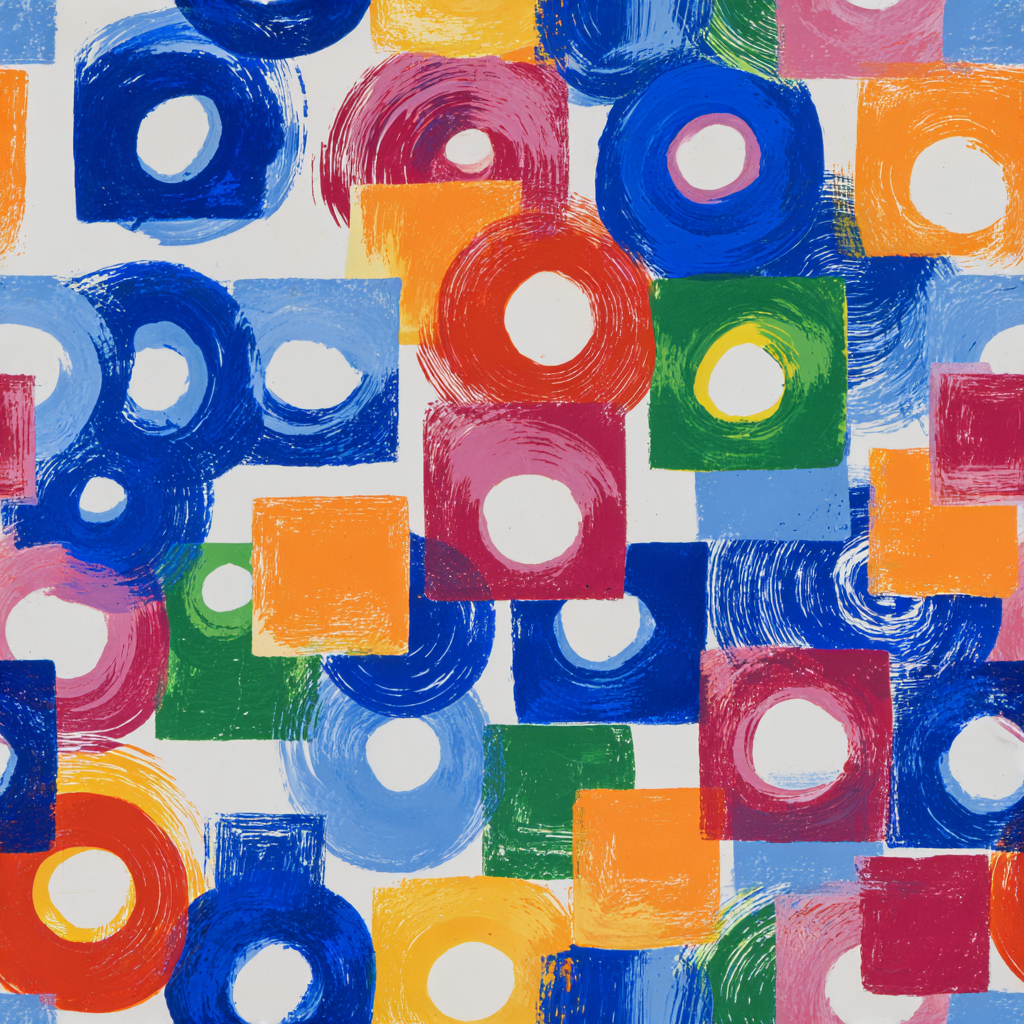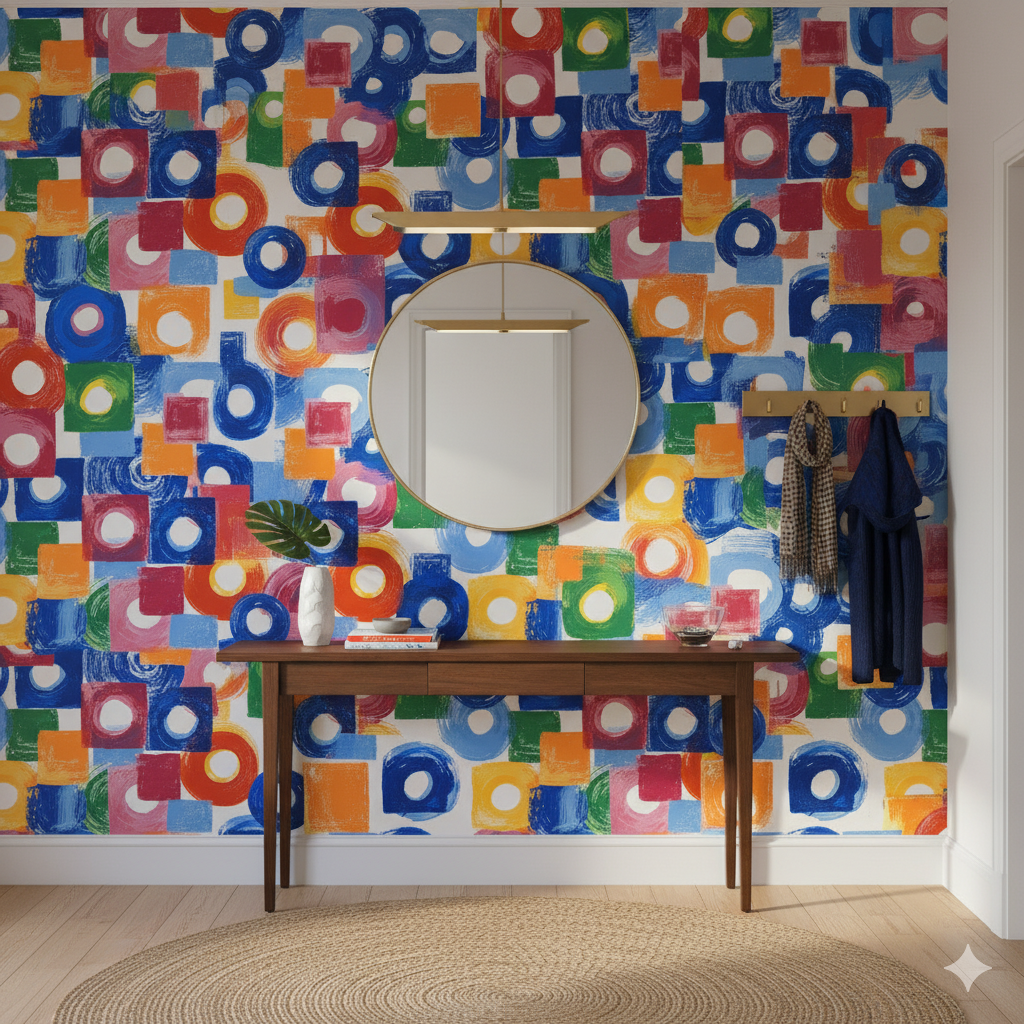 Orbit Theory is a study in playful geometry — concentric circles and squares rendered in vibrant hues of cobalt, crimson, lemon, and green overlap in a rhythmic collage. The imperfect brush texture softens the edges, keeping the design lively and approachable. Reminiscent of mid-century modern abstraction, it adds visual movement without overwhelming. Ideal for family spaces, playrooms, or design-forward offices, it pairs perfectly with minimalist furniture, lacquered surfaces, and white walls that let its color theory shine.