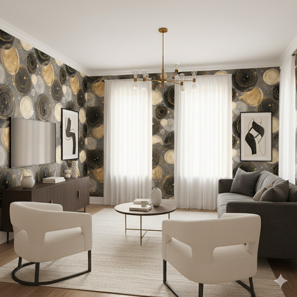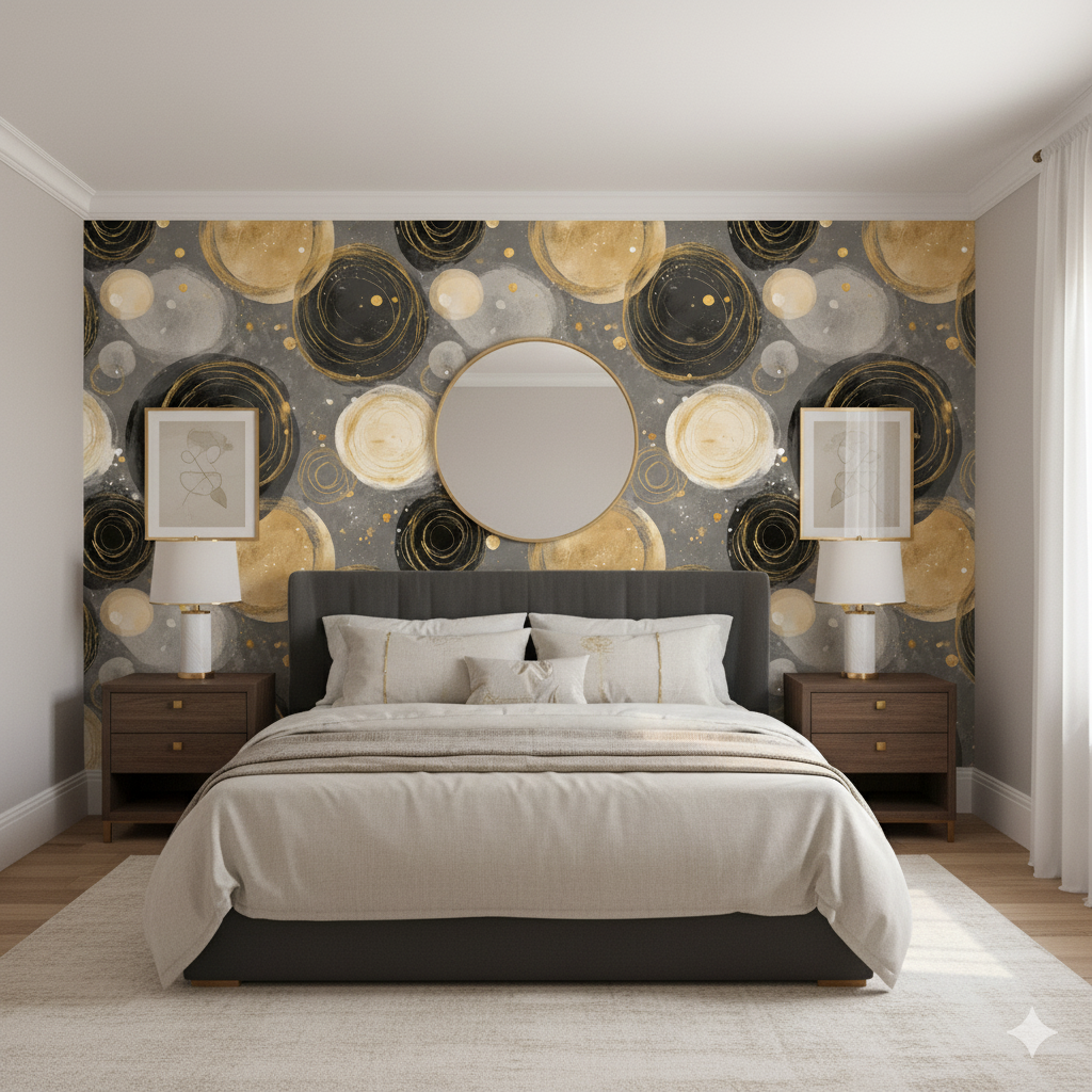 Concentric circles ripple outward in glowing shades of gold, cream, and charcoal, resembling planetary diagrams or the motion of celestial orbs across a night sky. The abstracted astronomy feel makes this wallpaper at once mystical and modern, offering an intellectual and artistic sensibility. Each circular form feels hand-drawn, with metallic highlights that shimmer as light moves across the surface. Perfect for libraries, lounges, and feature walls, it offers depth and intrigue, creating an environment that feels thoughtful yet playful, rooted in both science and art.