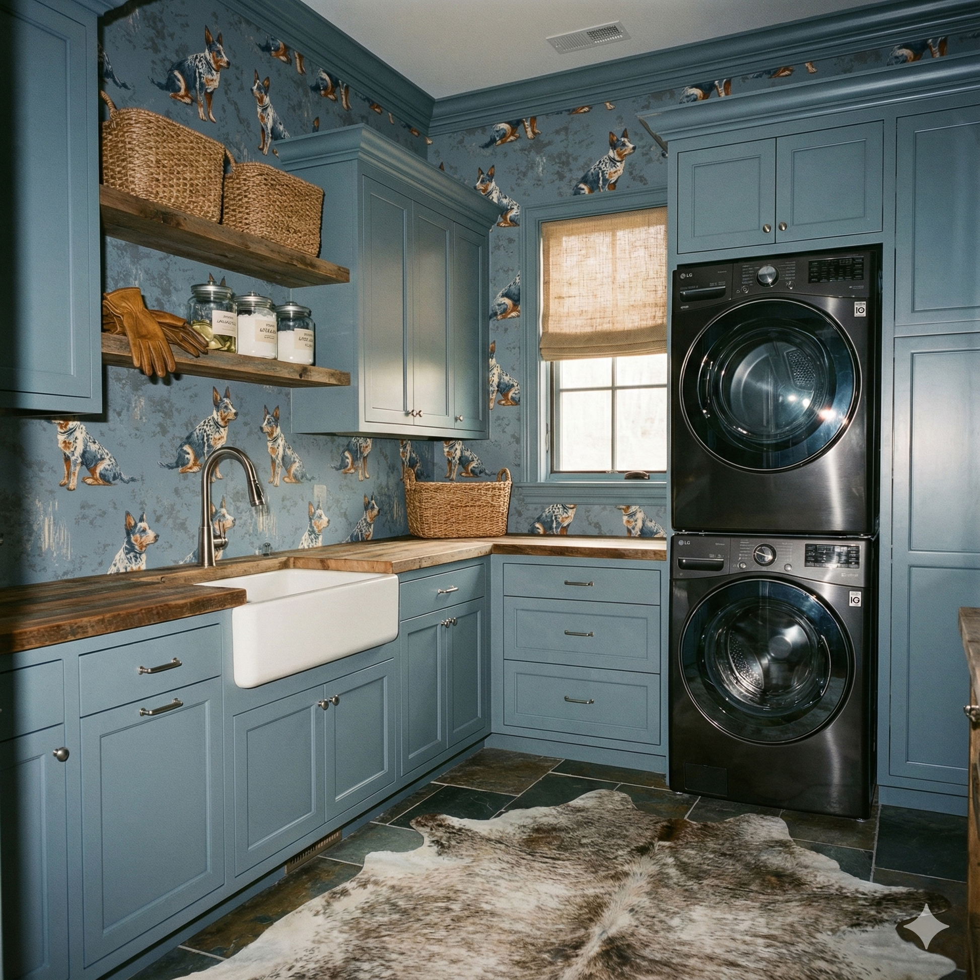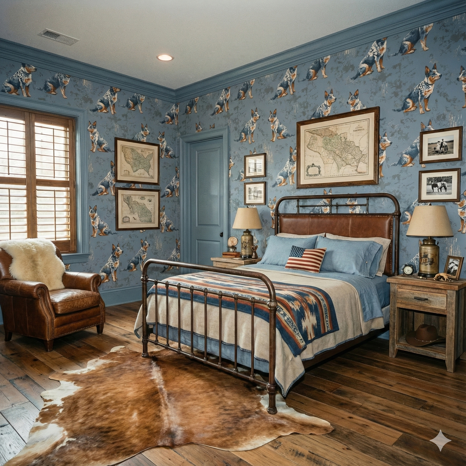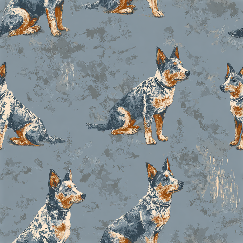 Australian Cattle Dogs sit alert against a misty slate-gray background mottled with textured brushwork, echoing rugged terrain at first light. The palette — dusty blue, amber, and steel — feels grounded and outdoorsy, yet refined enough for a contemporary ranch or mountain retreat. It’s a nod to the working spirit and loyalty of the breed, bringing subtle energy and natural grit into interior spaces. Perfect for masculine bedrooms, rustic foyers, or cabins that favor understated texture over excess polish.