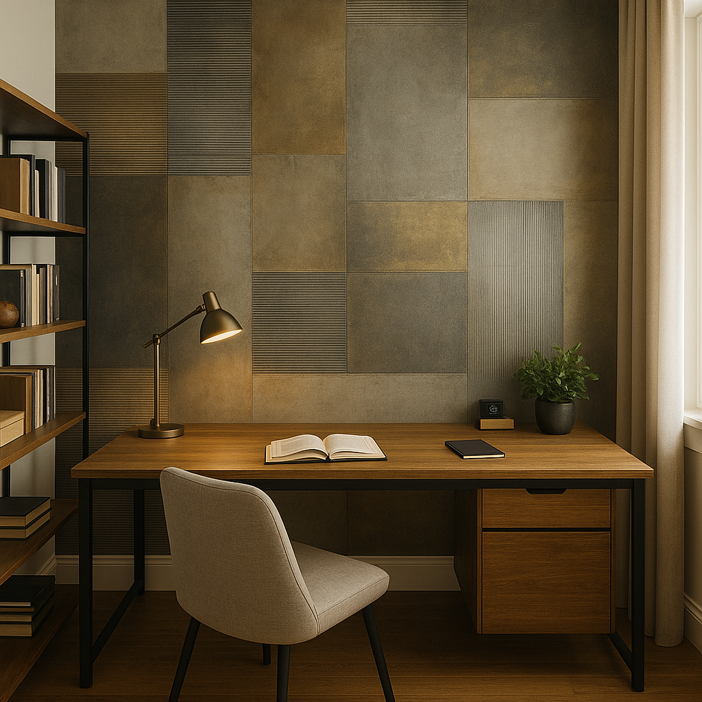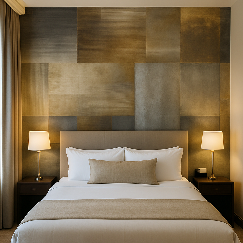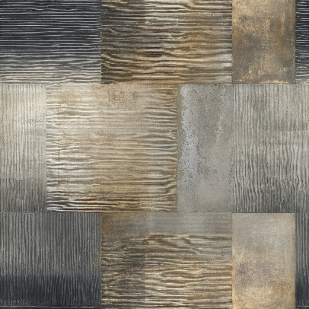 Industrial meets artisanal in "Oxide Block," a metallic-inspired wallpaper made of overlapping panels with brushed textures and oxidized finishes. Featuring tones of graphite, bronze, pewter, and slate, the varied surface detailing mimics worn metal and concrete with painterly realism. This geometric industrial wallpaper is ideal for lofts, statement walls, or masculine offices that crave raw sophistication.