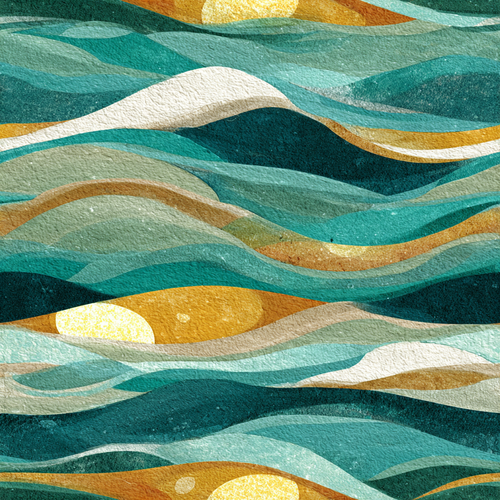 Undulating waves of turquoise, teal, and amber sweep across a textured canvas, evoking the rhythmic rise and fall of the Pacific Ocean under golden light. The stylized abstraction feels modern yet organic—each band of color layered like a painter’s study of light and water. Perfect for coastal living rooms, contemporary spas, or minimalist bedrooms, it creates movement without chaos. Works beautifully with sandy neutrals, rattan, and matte black accents for a tranquil, sun-washed modern retreat.