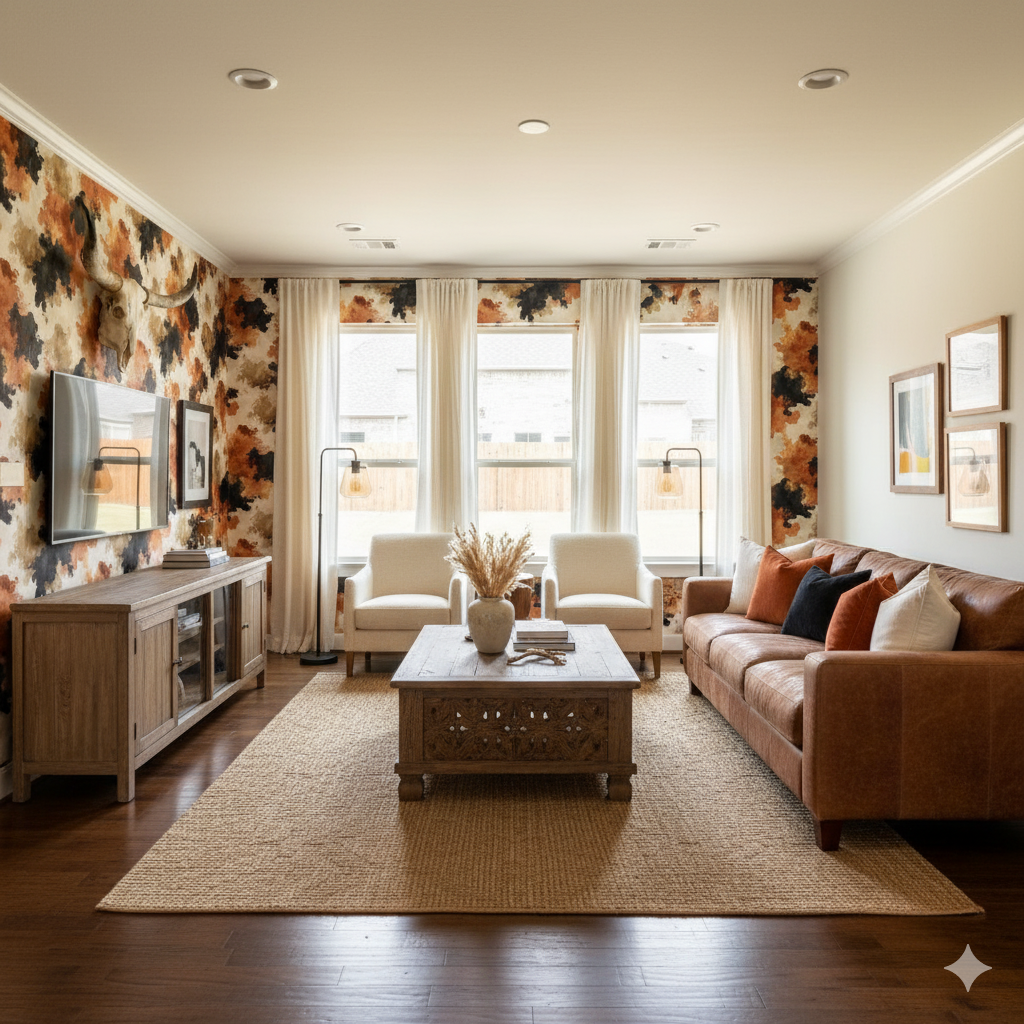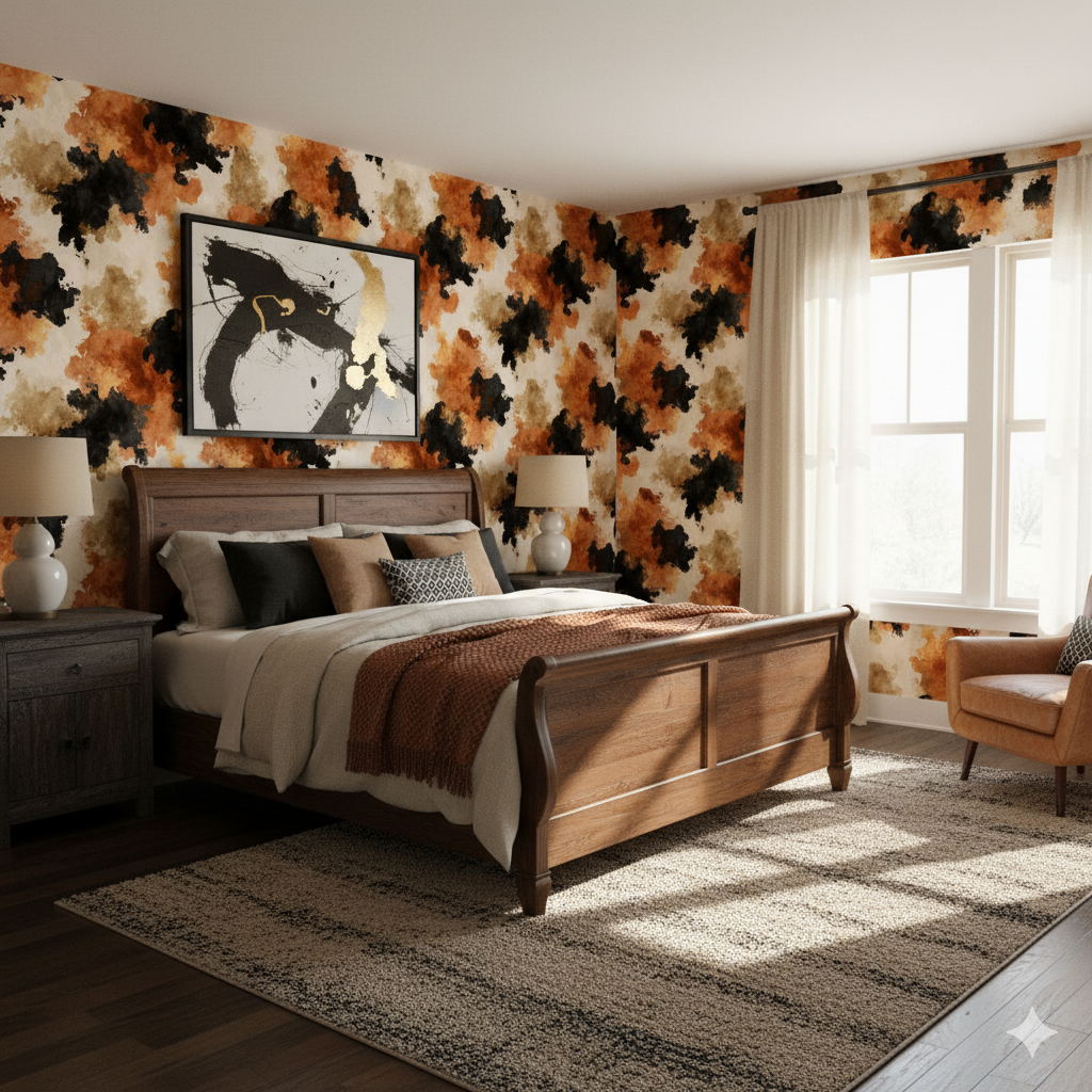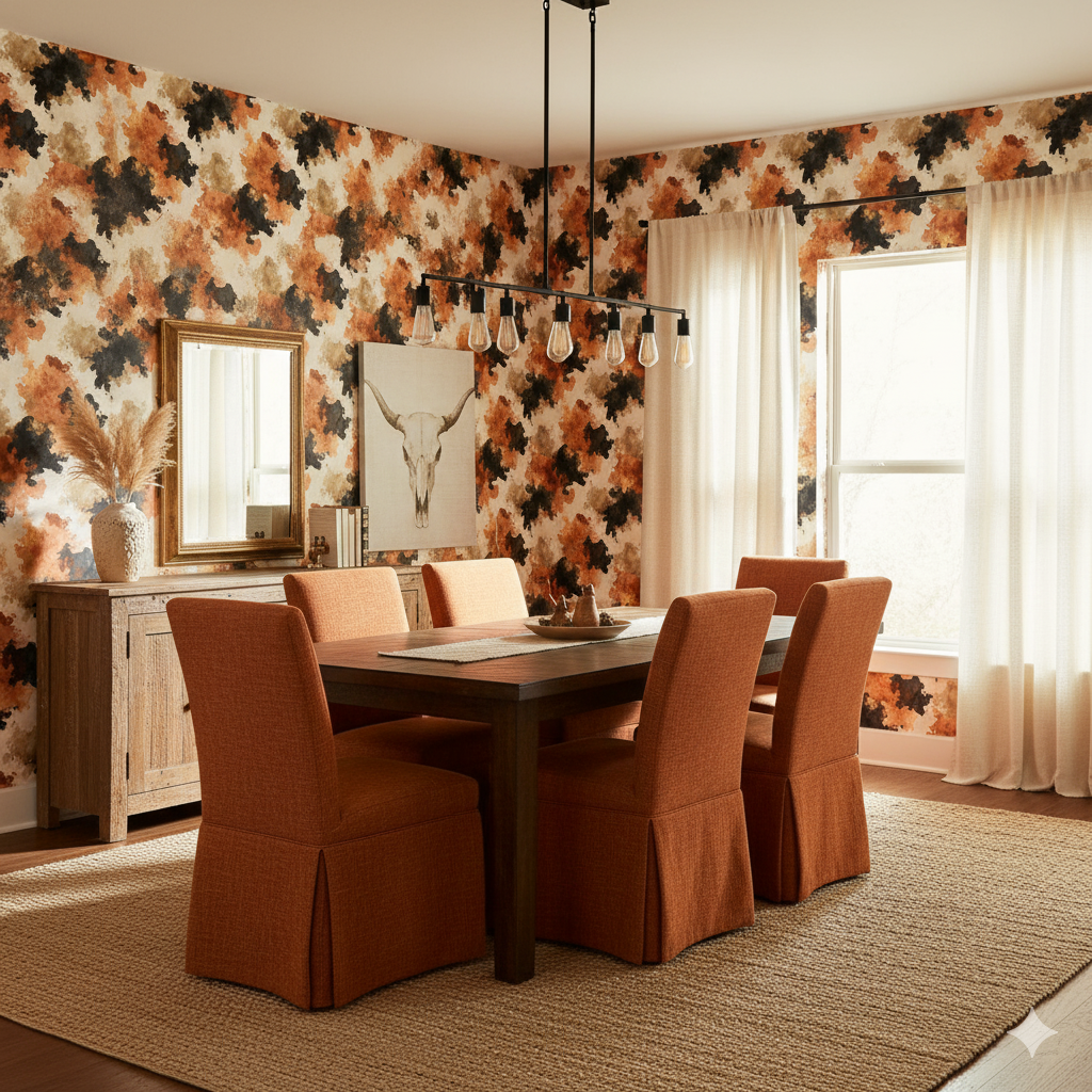 With bold splashes of russet, black, and tan bleeding into one another, this pattern reimagines the texture of cowhide in a painterly, abstract style. Unlike literal animal prints, the design feels expressive, with watercolor-like movement and tonal layering that adds warmth and character. Perfect for an accent wall in a contemporary loft, a Western ranch retreat, or even a boutique with earthy, natural design cues. Its organic irregularity makes it versatile, pairing well with both sleek, minimal furnishings and rugged, handcrafted décor.
