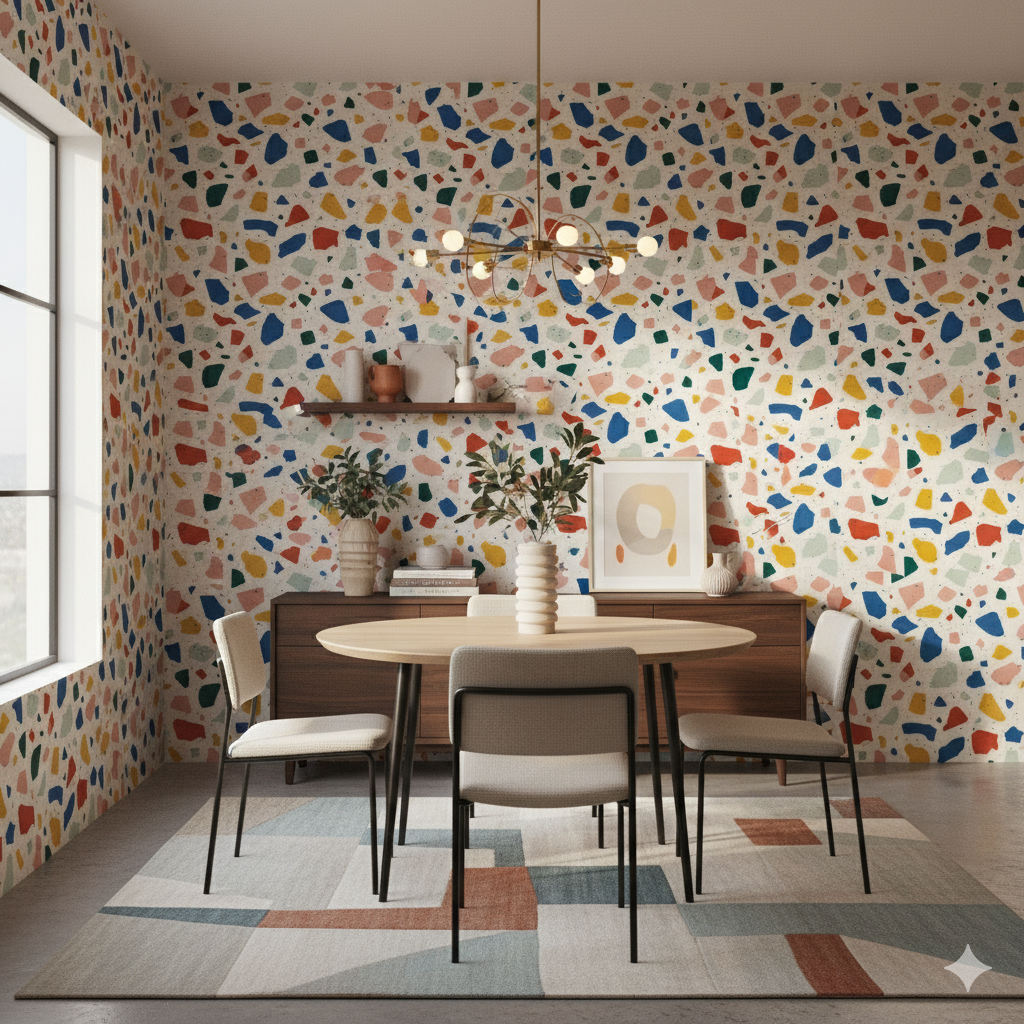 This playful terrazzo bursts with saturated primary and secondary colors—crimson red, cobalt blue, golden yellow, forest green, and blush pink—scattered like confetti across a cream base. The bold palette and large-scale shards give Paloma Fiesta a youthful energy, perfect for children’s playrooms, eclectic dining spaces, or modern lofts that thrive on color. Its painterly fragments have a hand-drawn charm, reminiscent of Matisse cutouts, and bring a lively spontaneity to interiors. For those unafraid of strong design statements, this wallpaper creates an unmistakably vibrant backdrop.