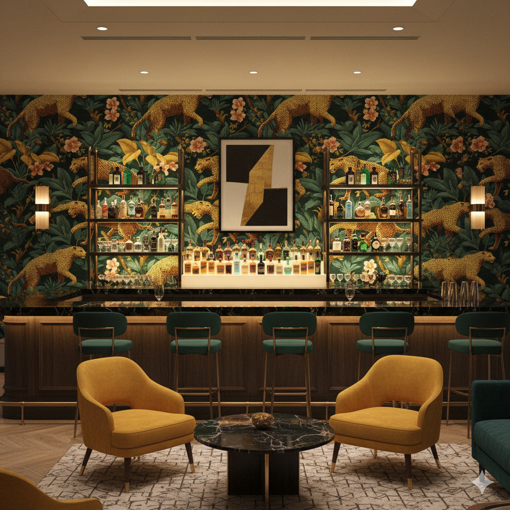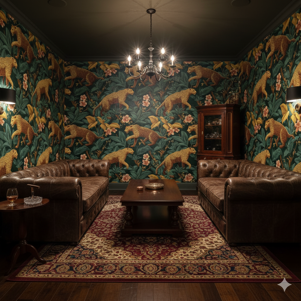 Unleash your wild side with Panthera Parade, a maximalist jungle scene teeming with prowling cheetahs, lush foliage, and tropical blooms. Golden cats pop against deep emerald leaves and coral florals, making this wallpaper a showstopper for powder rooms, boutique entryways, or eclectic statement walls.
