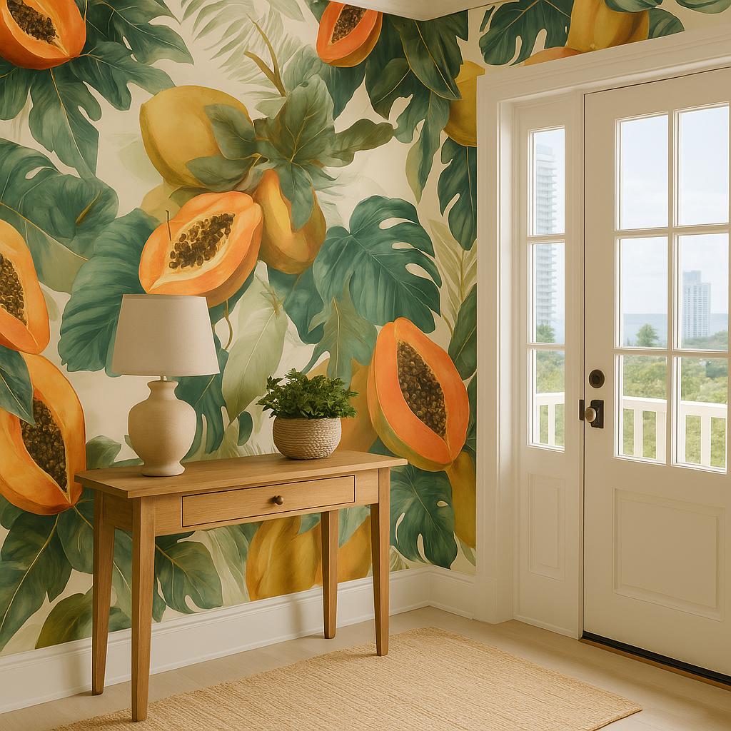 Juicy and vibrant, "Papaya Mirage" bursts with ripe tropical energy. Lush papaya fruits—some halved to reveal their glossy black seeds—sit nestled among oversized teal monstera leaves and soft ochre foliage. The bold coral-orange tones contrast beautifully against a creamy tropical backdrop, creating a richly layered, painterly effect. Ideal for accent walls in dining rooms, sunrooms, or bold powder rooms craving a touch of the exotic.