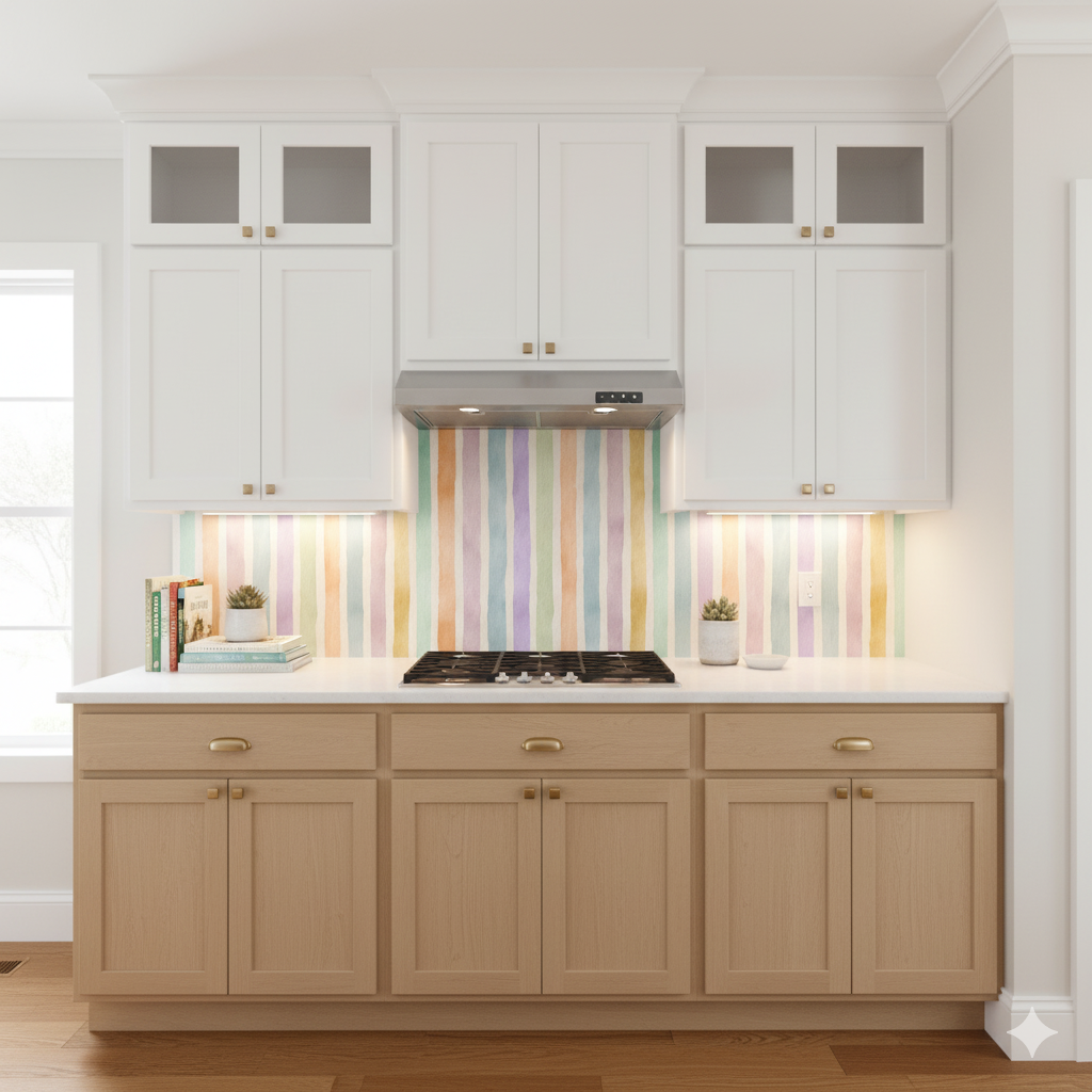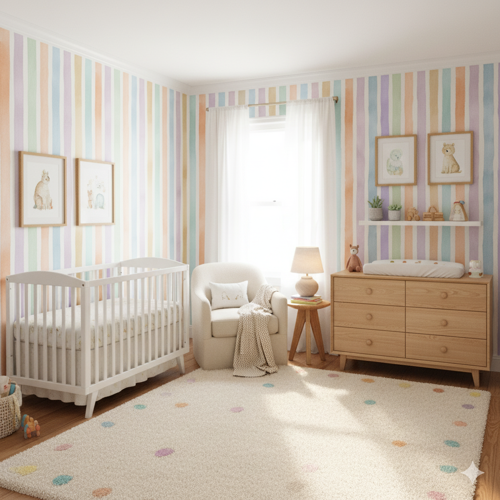 Delicate watercolor stripes in soft lavender, sage, peach, sky blue, butter yellow, and aqua march evenly across the canvas, separated by bright white channels. The result is cheerful, lighthearted, and reminiscent of seaside boardwalks or children’s watercolor palettes. This design is ideal for nurseries, playrooms, or cheerful kitchens, but can also lend a breezy, retro-inspired charm to eclectic living spaces. Its versatility makes it a fit for both family-friendly and whimsical boutique interiors.