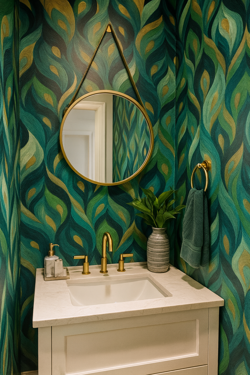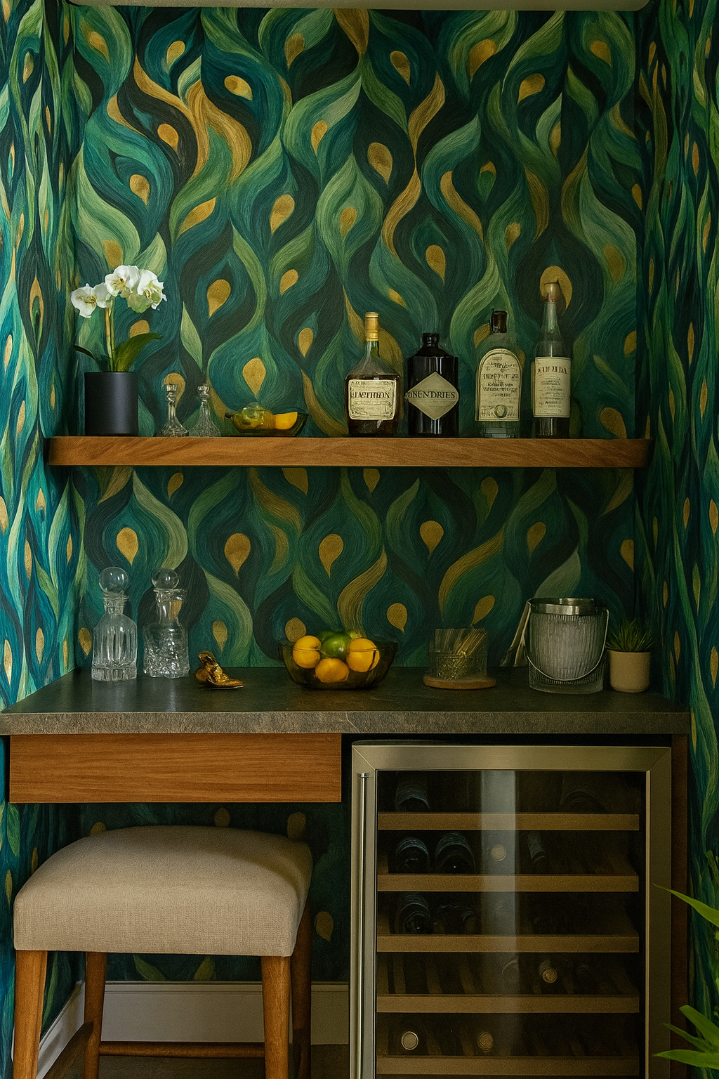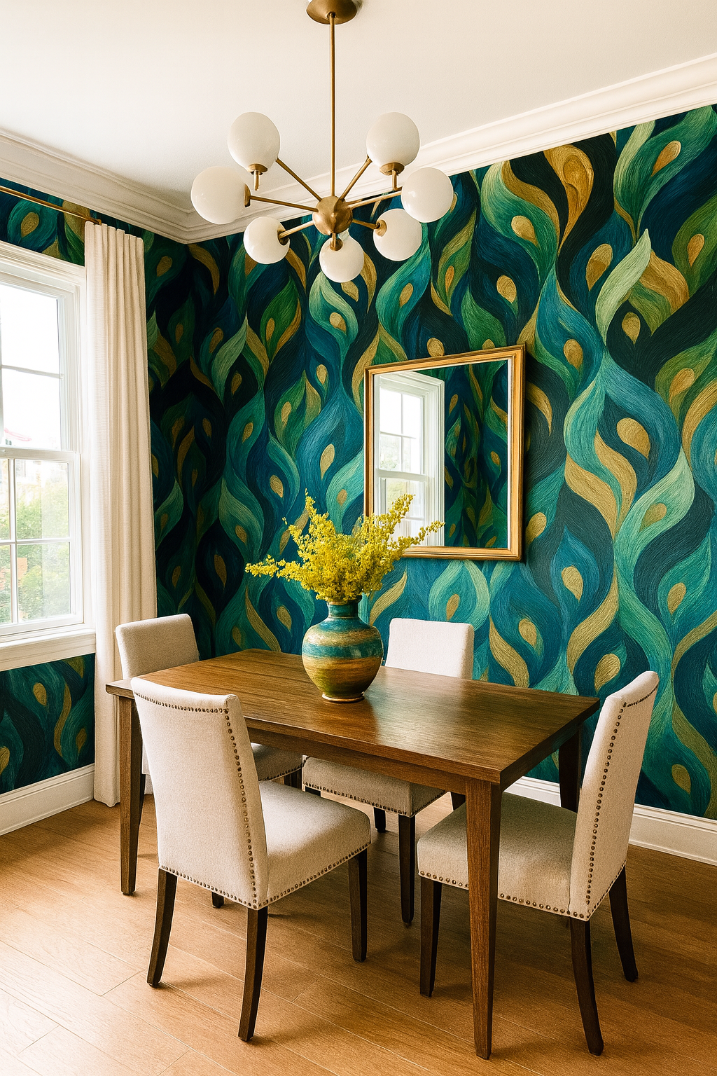 A hypnotic, almost tactile celebration of elongated peacock feathers, Peacock Mirage features sweeping strokes of turquoise, jade, gold, and ink. The pattern feels hand-carved, painterly, and richly dimensional. It's perfect for moody lounges, creative studios, or eclectic parlors. If your space is a canvas, this is your wild, luxurious brushstroke.