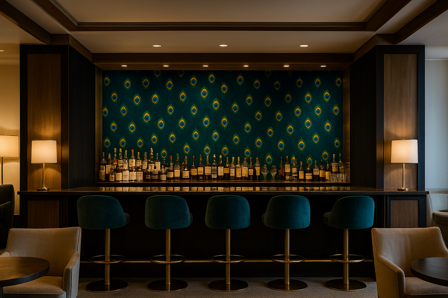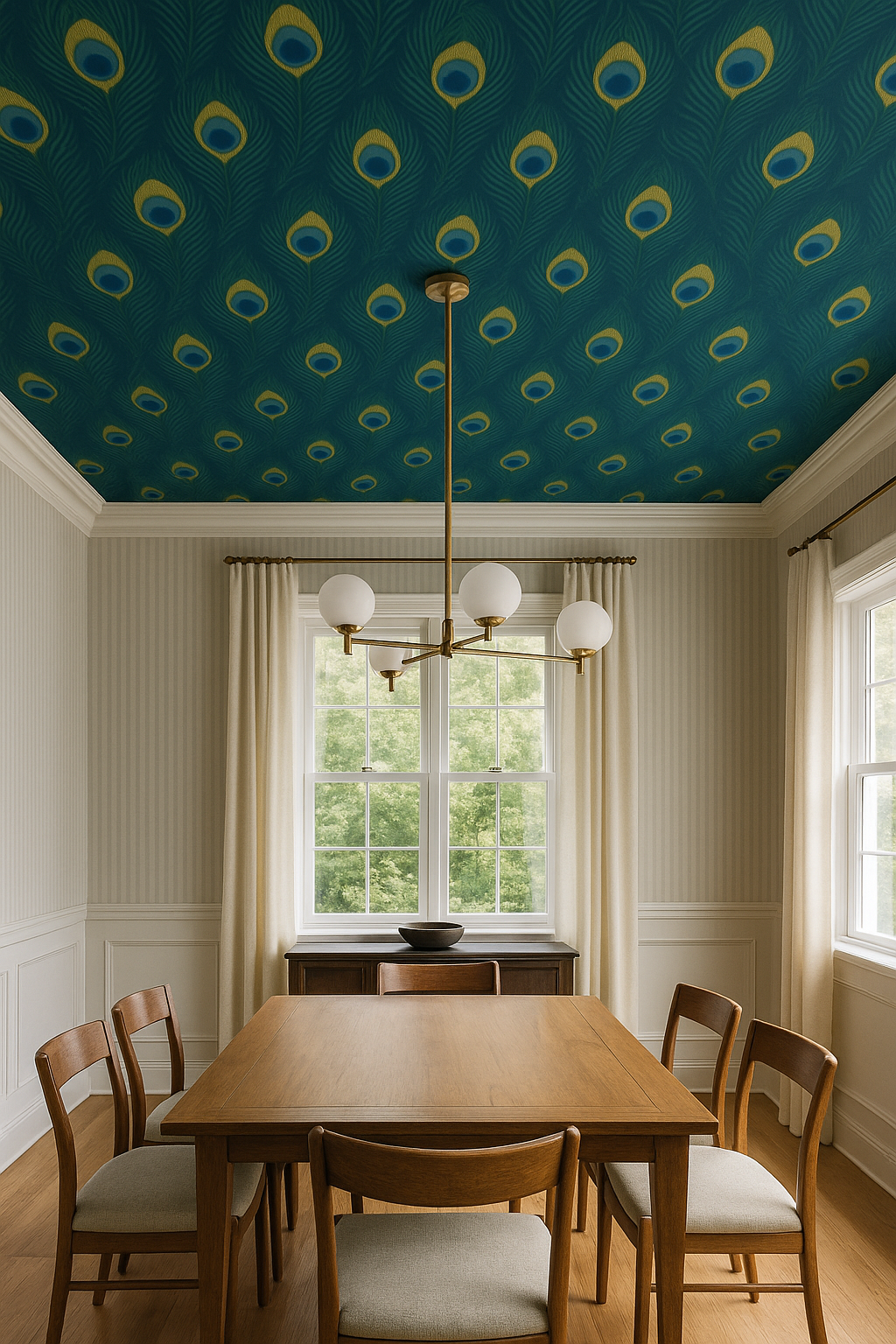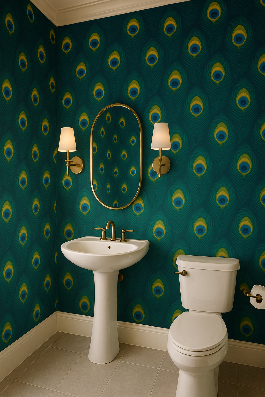 Peacock Parade Wallpaper brings drama and glamour with elegant peacock feather motifs in rich jewel tones of emerald, sapphire, and gold against a deep background. This bold pattern makes an opulent statement in powder rooms, dining spaces, or eclectic living rooms. Perfect for customers seeking peacock wallpaper, feather motif wallpaper, jewel tone wall coverings, or maximalist wallpaper for bold, luxurious interiors.