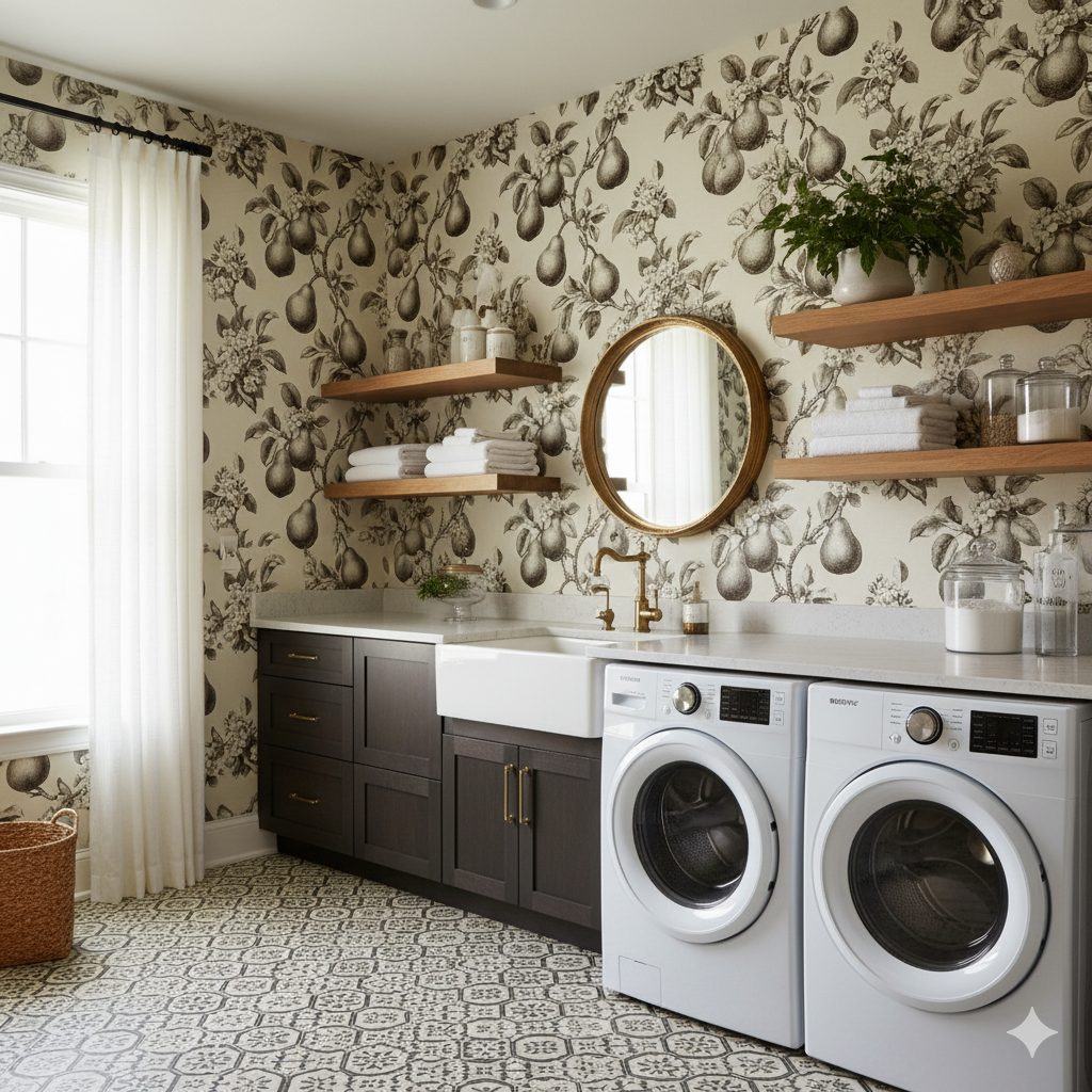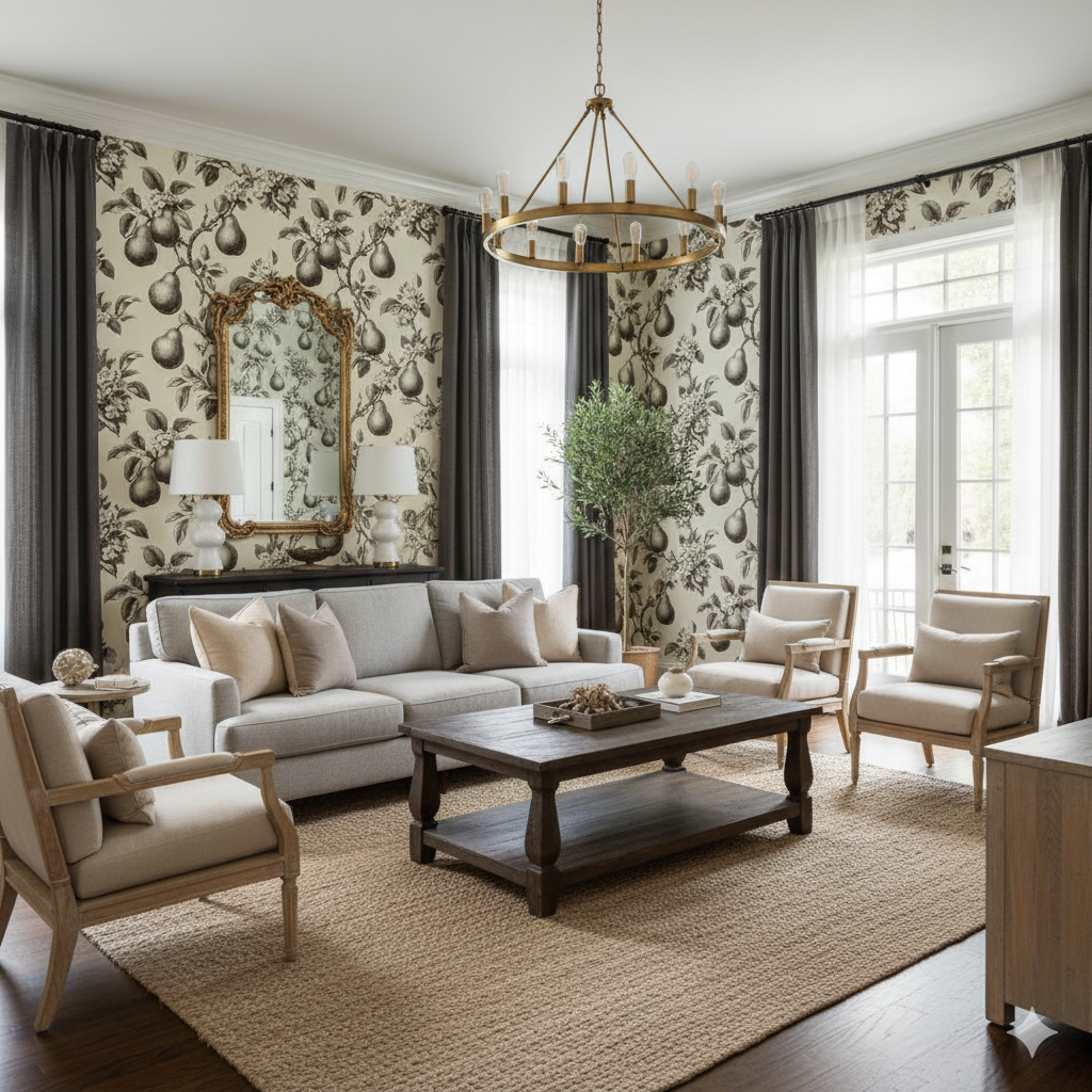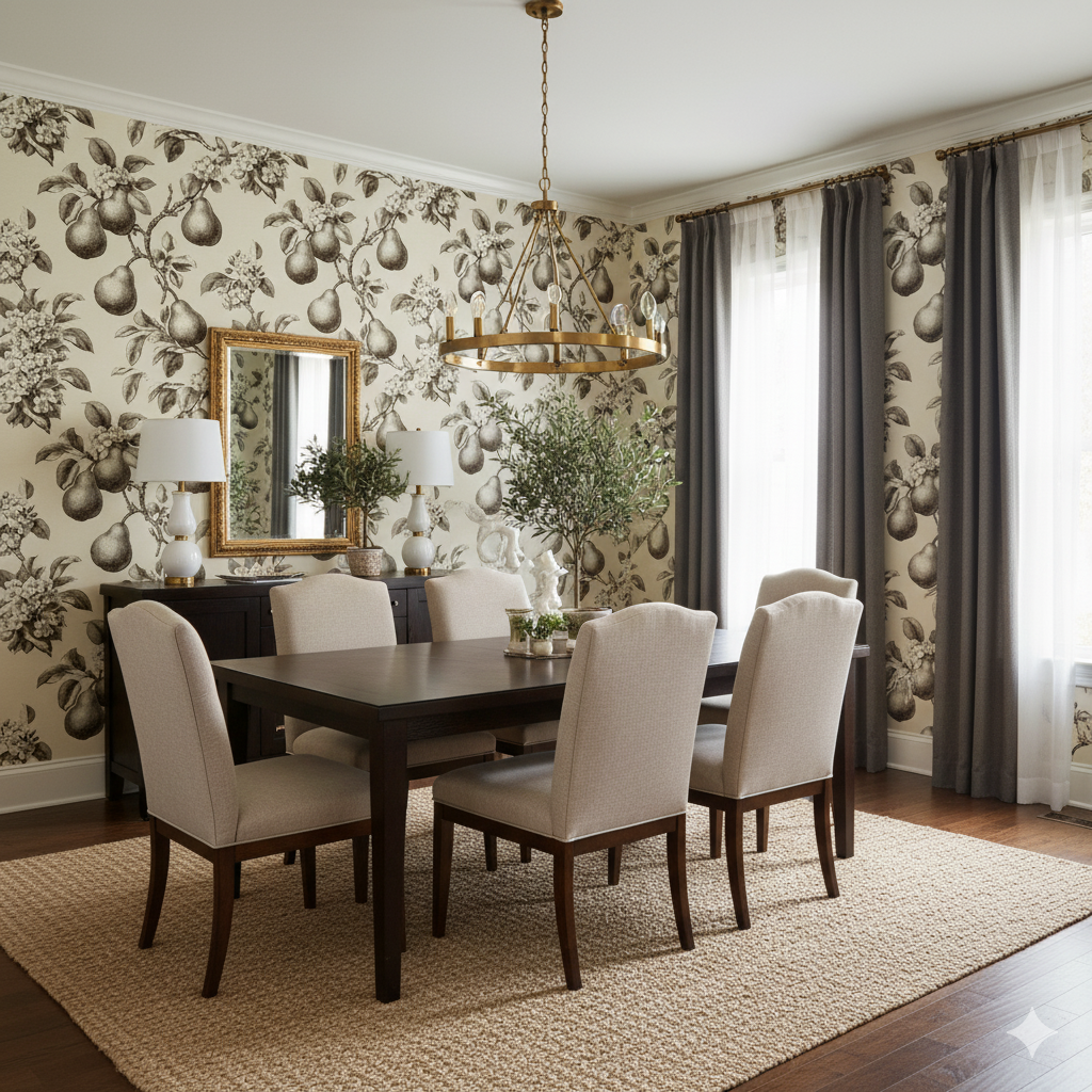 With Victorian flair and orchard charm, "Pear & Proper" showcases engraved-style pear clusters blooming on leafy branches. The sepia-toned ink on a cream background balances antique precision with pastoral warmth. This pattern is a perfect backdrop for French country dining rooms, classic foyers, or farmhouse pantries in need of a heritage touch.