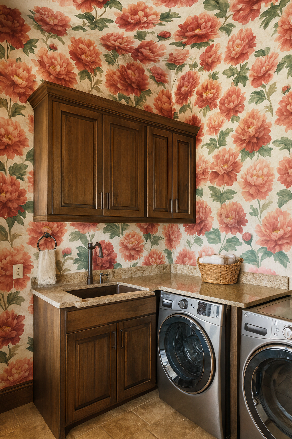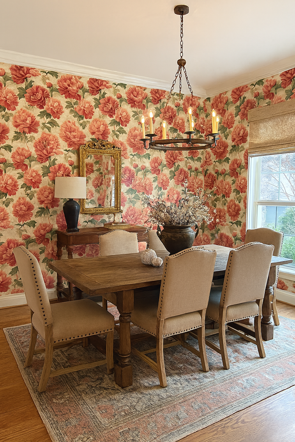 “Peony Rhapsody” is a romantic wallpaper bursting with overscale peony blossoms in shades of deep rose, blush, and crimson. Layered with leafy greens and earthy undertones, this design evokes a lush garden in full bloom. The painterly style offers depth and softness, making it perfect for vintage-style bedrooms, luxurious dining rooms, or statement-making powder rooms with dramatic flair.