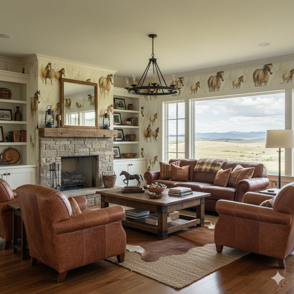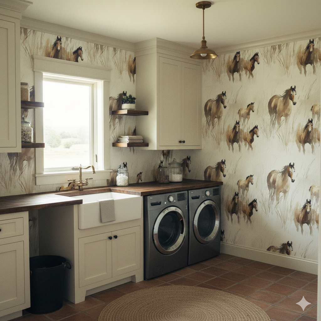 Prairiewind is an ode to quiet movement and open space. Soft watercolor brushwork captures mares and foals drifting through tall golden grass, their forms dissolving into the light. The palette — sand, fawn, and sepia — feels sun-warmed and nostalgic, evoking late afternoons on the plains. This wallpaper radiates calm and grace, perfect for bedrooms, nurseries, or rustic-modern living spaces. Prairiewind carries a painter’s tenderness: it breathes, glows, and turns any room into a tranquil expanse of open air and gentle rhythm.