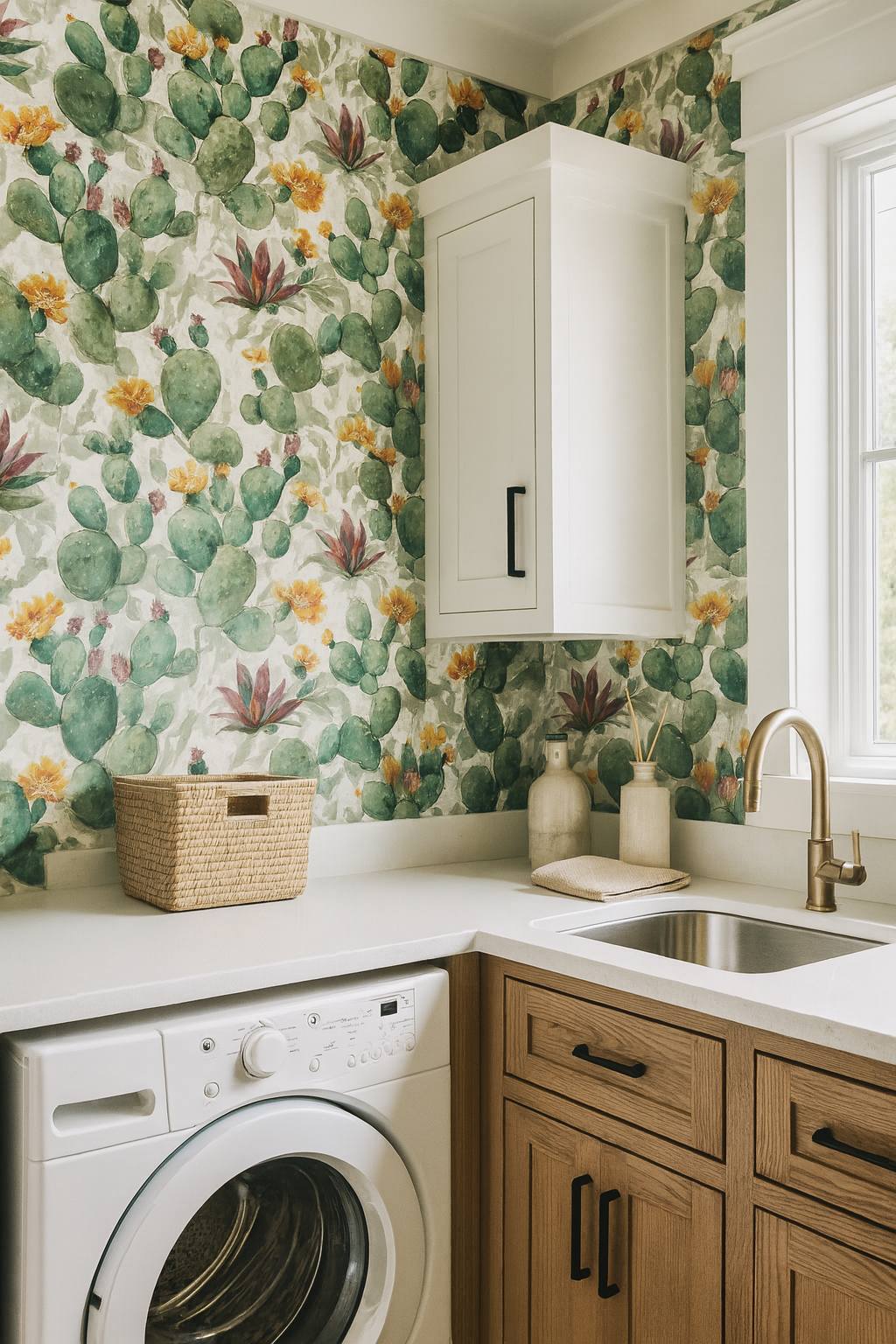 Lush clusters of watercolor prickly pear pads bloom with vibrant orange and magenta flowers in this lively desert garden wallpaper. Layered with painterly succulents and gentle washes of green, the soft ivory background lets the design breathe while the bold flora brings it to life. Ideal for boho living rooms, Southwestern bathrooms, or plant-lover pantries. It’s the wild, blooming Southwest—right on your walls.