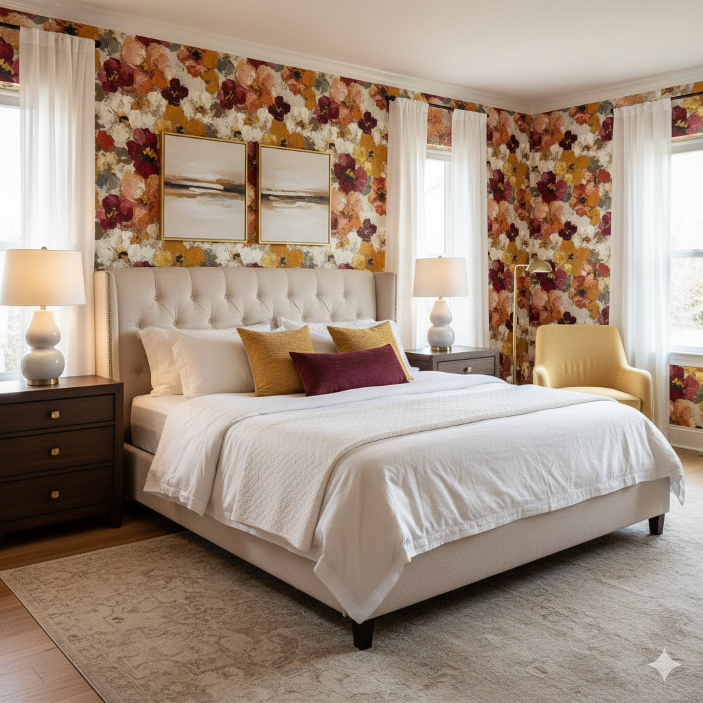 Bold, impasto florals in shades of crimson, burnt orange, ochre, cream, and soft blush dance across a neutral linen-like base. Each flower looks as if it were painted directly onto the wall with a palette knife, giving rooms a sense of artistic depth and texture. The vibrant tones make it an energizing choice for creative spaces, dining areas, or anywhere a lively focal point is desired. It pairs well with rustic woods, French farmhouse décor, or even modern minimalist interiors that crave a touch of painterly boldness.