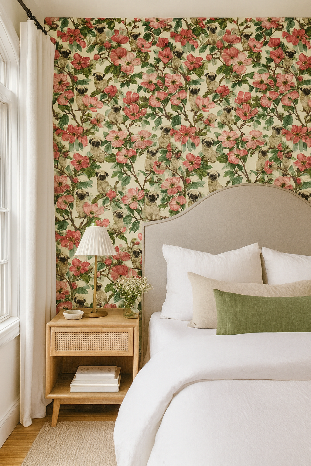 A frolic of pugs prancing among oversized coral and crimson dogwood flowers creates a playful-meets-pretty statement. With its watercolor realism and soft ivory backdrop, this pattern feels equally romantic and cheeky. Ideal for eclectic bedrooms, boutique hotel accents, or conversation-starting powder rooms.