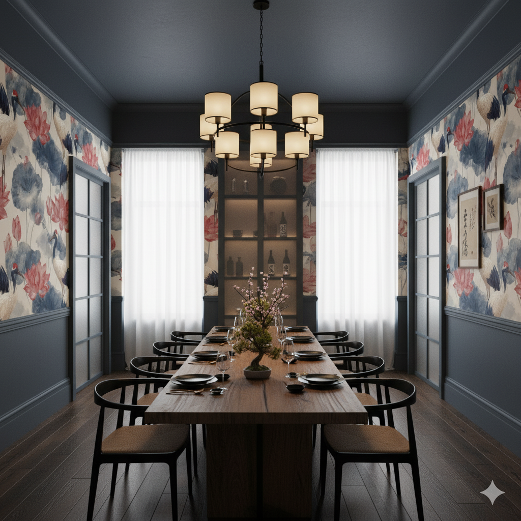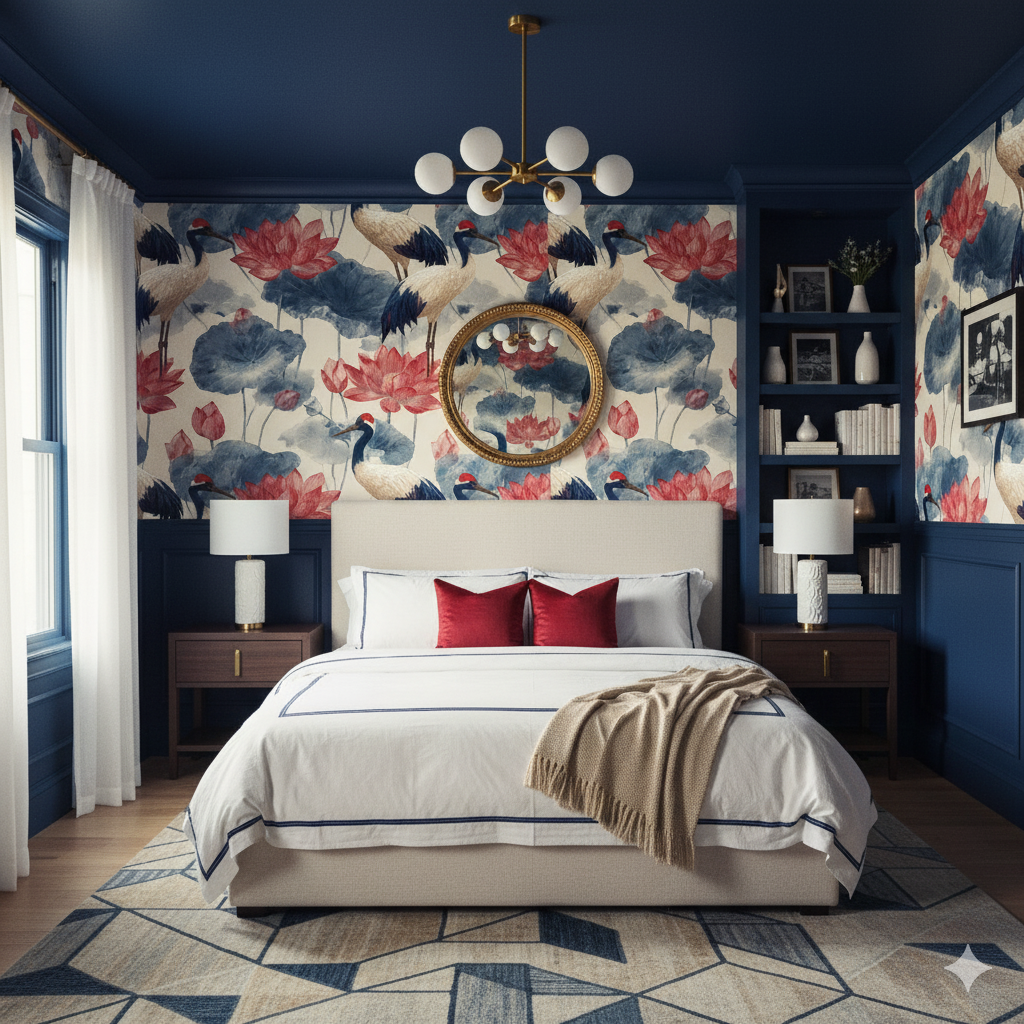 A portrait of balance and vitality, Red Lotus Court weaves together Eastern elegance and painterly precision. Crimson lotus blossoms bloom among broad indigo leaves, while long-necked cranes move gracefully through the composition — symbols of longevity and grace. The parchment background softens the bold interplay of colors, creating a wallpaper that feels both spiritual and architectural. Ideal for dining rooms, entry halls, or meditation spaces, Red Lotus Court introduces quiet drama through fine-line detail and painterly restraint. It’s a living fresco for modern interiors seeking depth and soul.