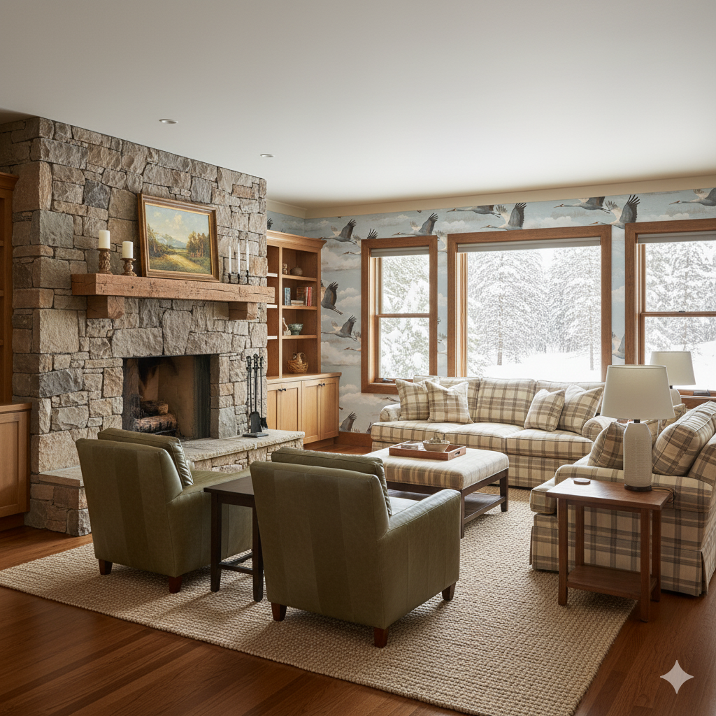 Redwing Passage captures the quiet power of migration — cranes gliding gracefully through an open sky painted in cool grays and soft beige. Their elongated wings and delicate silhouettes bring a sense of freedom and movement, while the layered clouds add depth and atmosphere. The palette evokes a muted sunrise over marshlands, making it ideal for serene bedrooms, reading nooks, or entryways that crave openness and light. When paired with linen drapery, pale oak, or soft blues, it feels like a breath of air — an elegant balance between structure and serenity.
