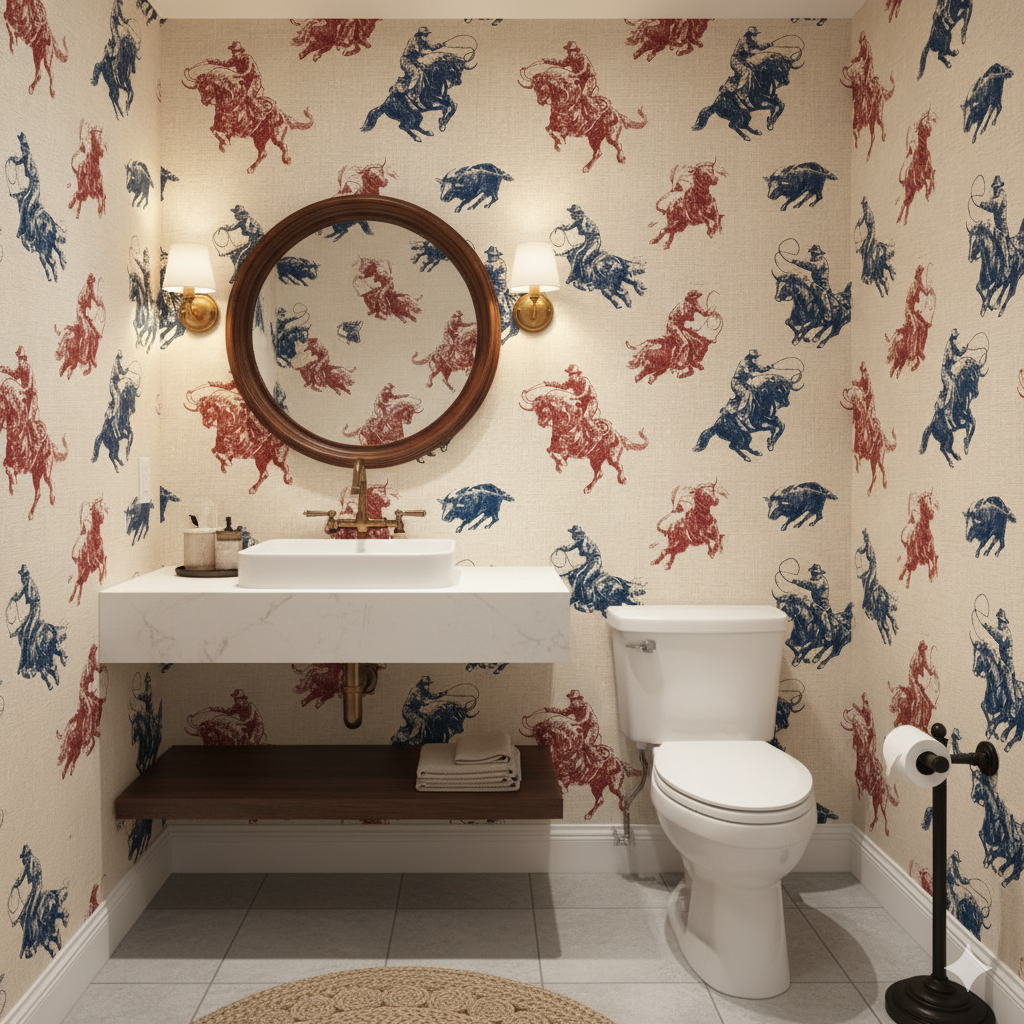 Energetic linework in deep navy and rustic red captures cowboys mid-action: lassoing, bucking, and riding in dynamic Western scenes. The cream linen-textured backdrop enhances the vintage Americana feel, like pages torn from an old rodeo poster. This wallpaper is an instant statement in game rooms, bars, or man caves, while also fitting into eclectic interiors with a love of folklore and storytelling. Its two-tone color palette keeps it cohesive, while the scenes themselves bring life and drama.