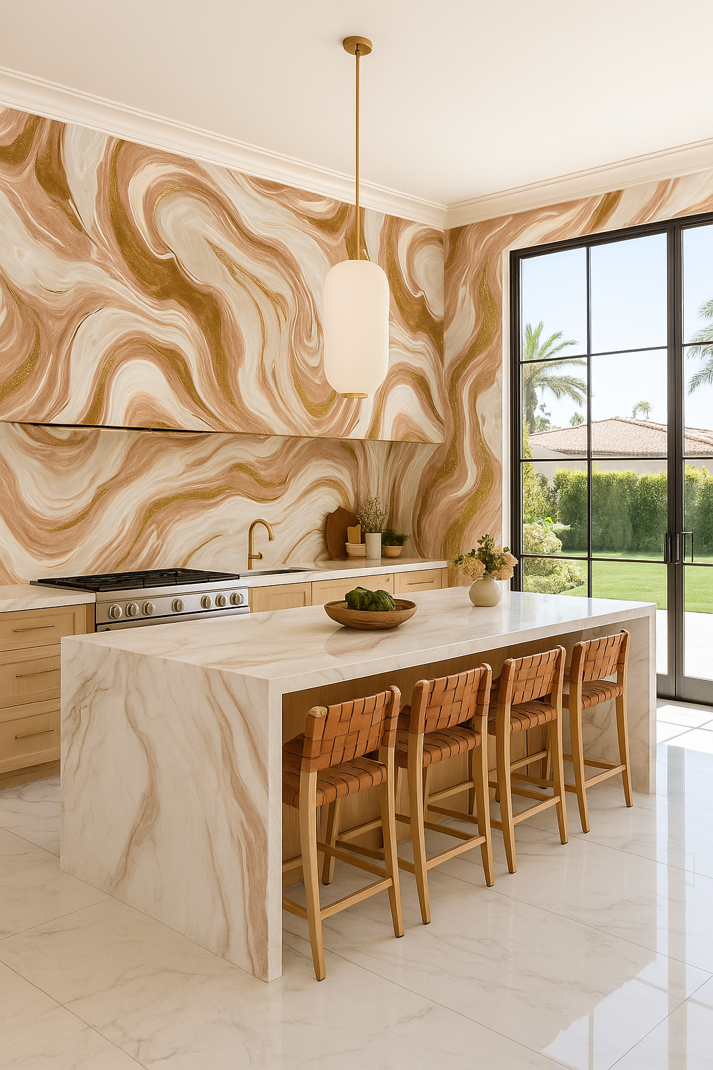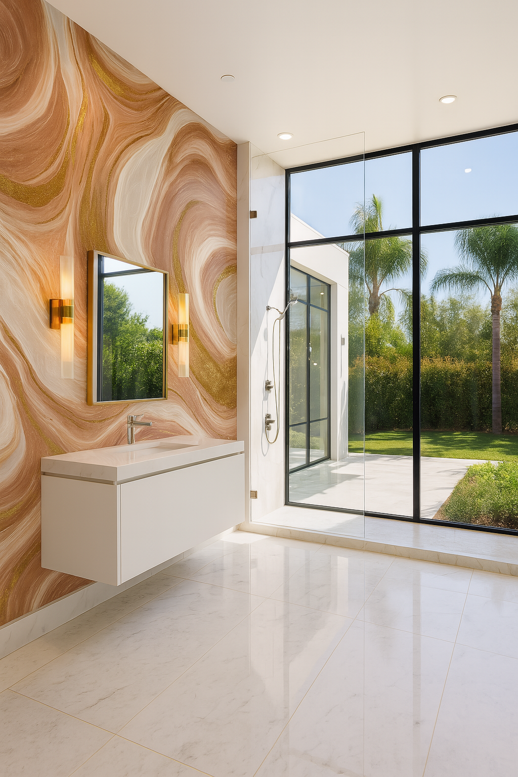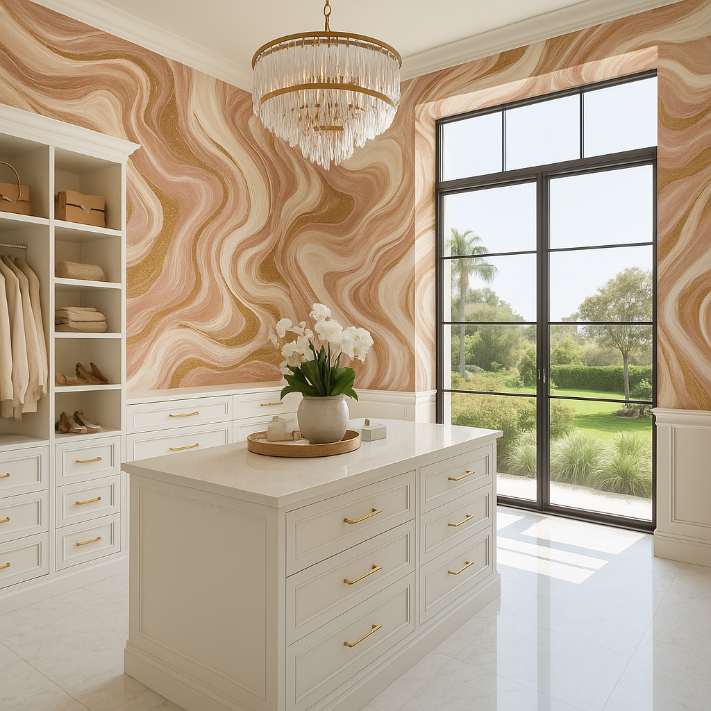 Swirls of rose quartz, white pearl, and shimmering gold create the luxe foundation of Rosé Marble — a pattern that feels like polished stone in motion. It’s equal parts glam and grounded, ideal for powder rooms, vanities, or fashion-forward accent walls. Pair with champagne-toned metals or minimal sculptural decor to let the veining do the talking. Fluid, feminine, and completely elevated.
