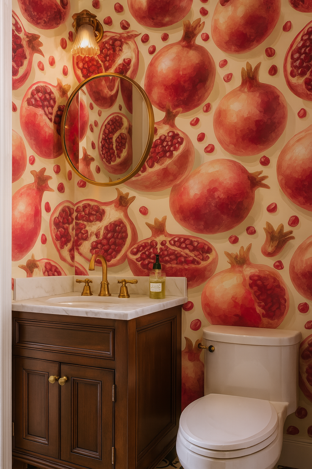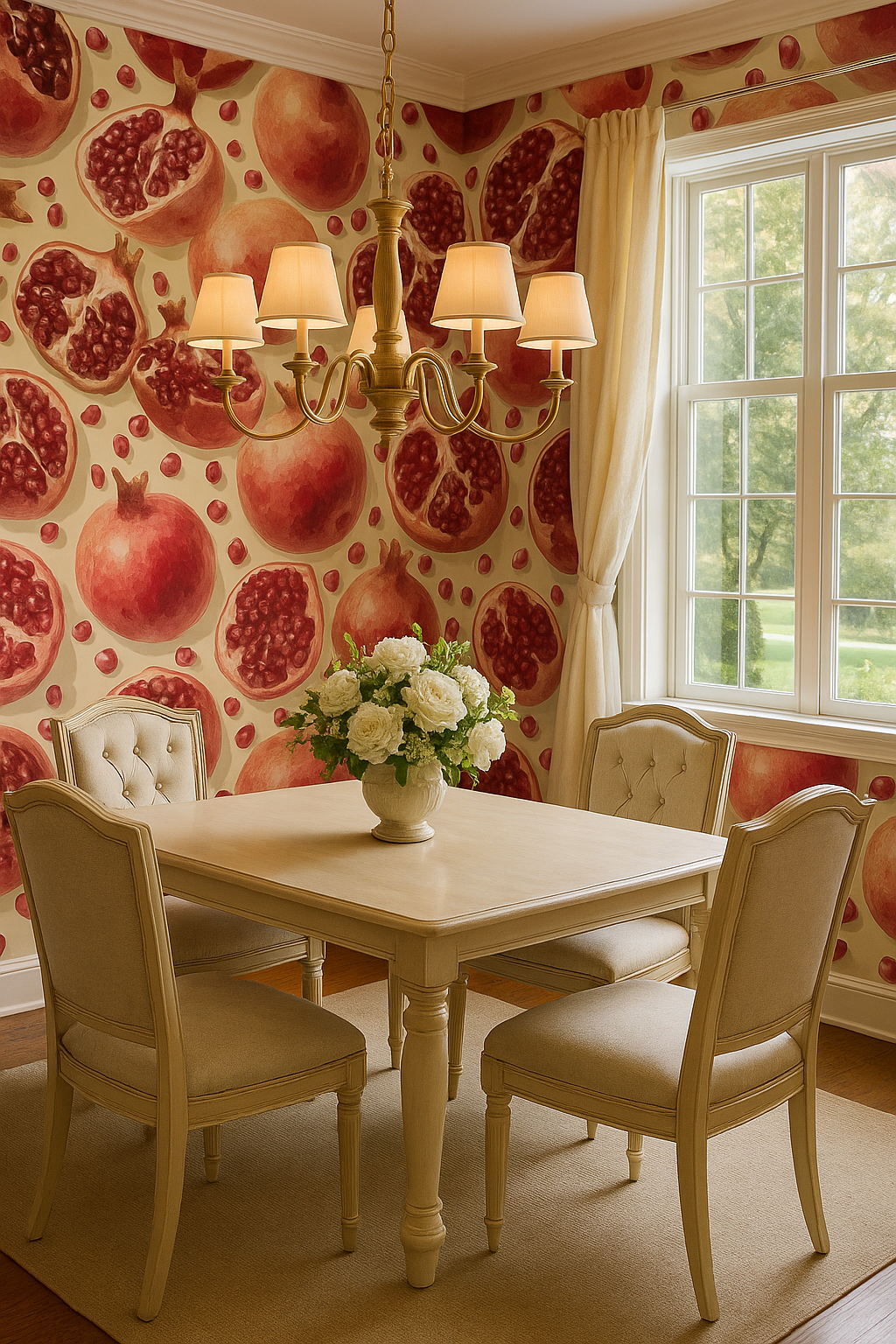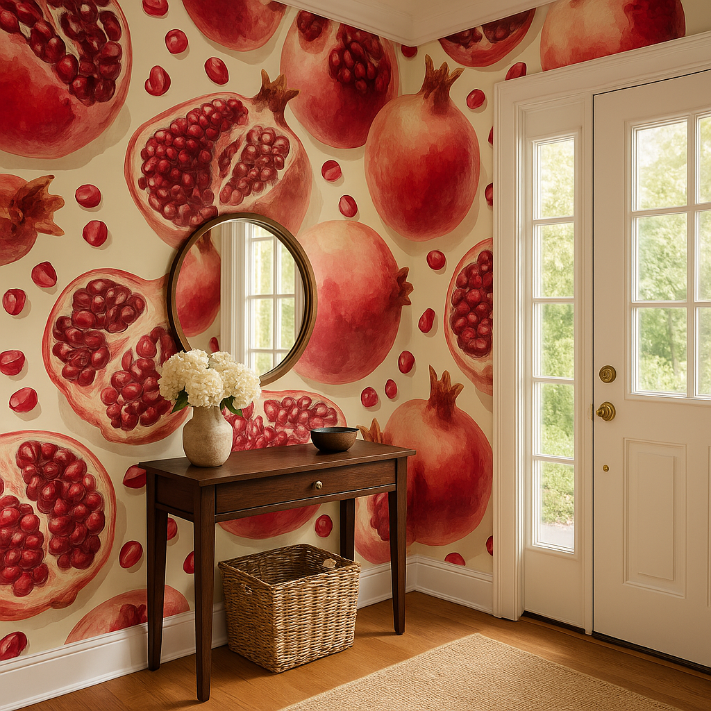 Search terms: pomegranate wallpaper, red fruit wall art, Mediterranean kitchen decor, watercolor fruit print.