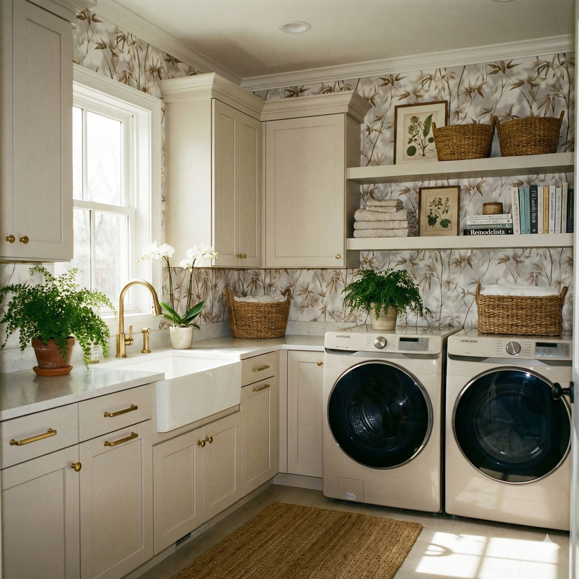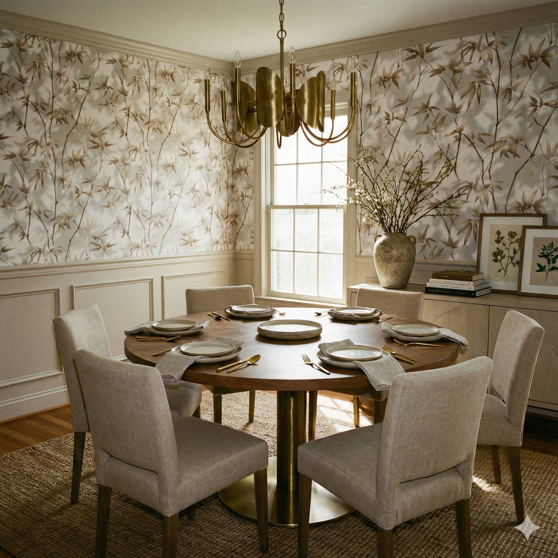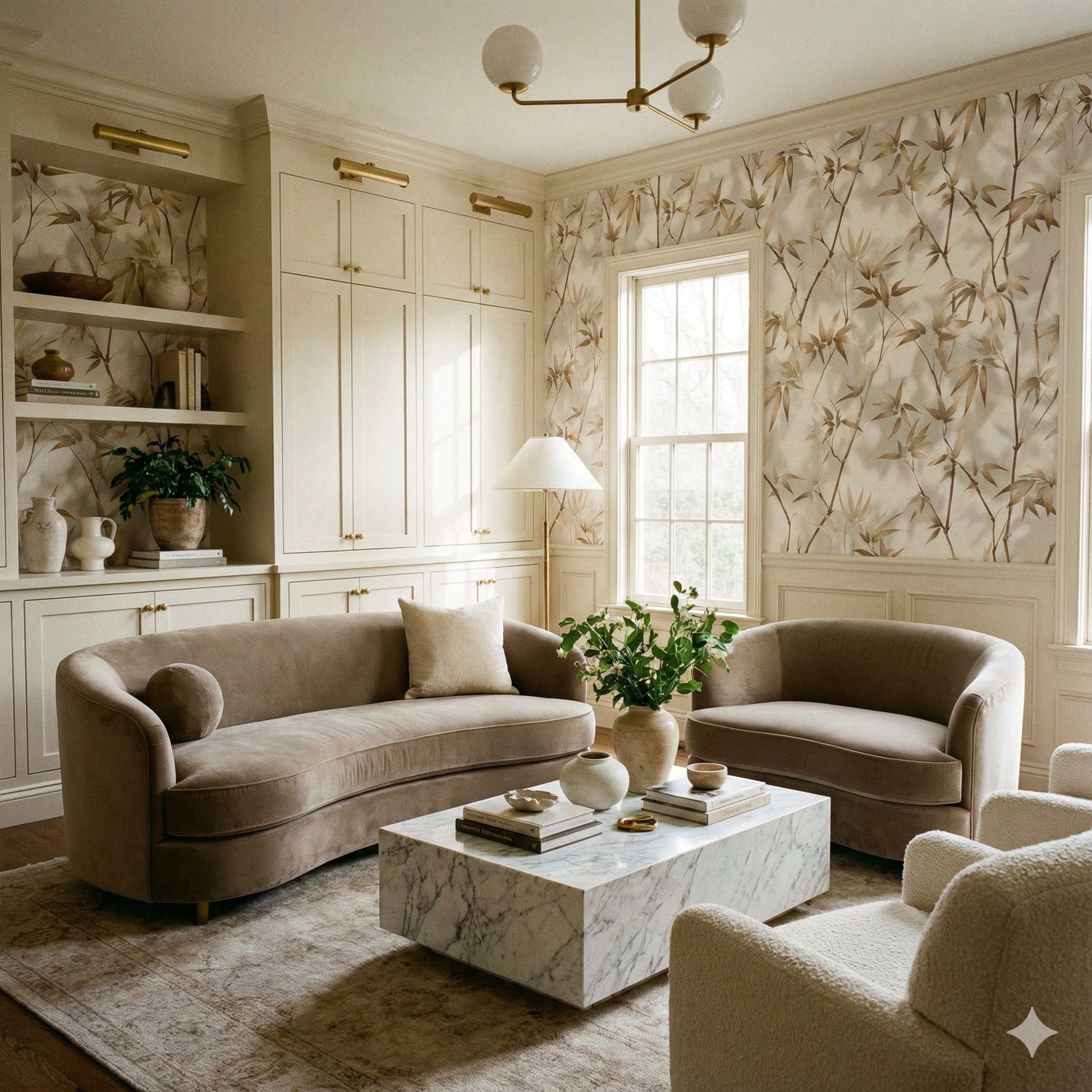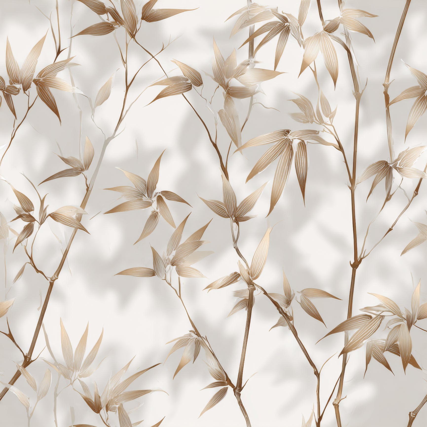 This design carries a serene, high-contrast elegance, built around slender cane-like stems and feathered leaves rendered in warm taupe, sand, and muted caramel against a clean, bone-white ground. The pattern feels weightless, almost suspended, with subtle shadows that create a soft three-dimensional effect as the branches drift upward. The repetition is calming rather than busy, making it ideal for spaces that need a refined, spa-like quiet: primary bathrooms, modern foyers, transitional living rooms, or airy sunrooms. The warm neutrals make it incredibly versatile; it pairs easily with natural woods, linen upholstery, brass accents, and organic materials. Despite its minimal palette, it feels rich and architectural, like something found in a boutique hotel that leans into understated luxury.