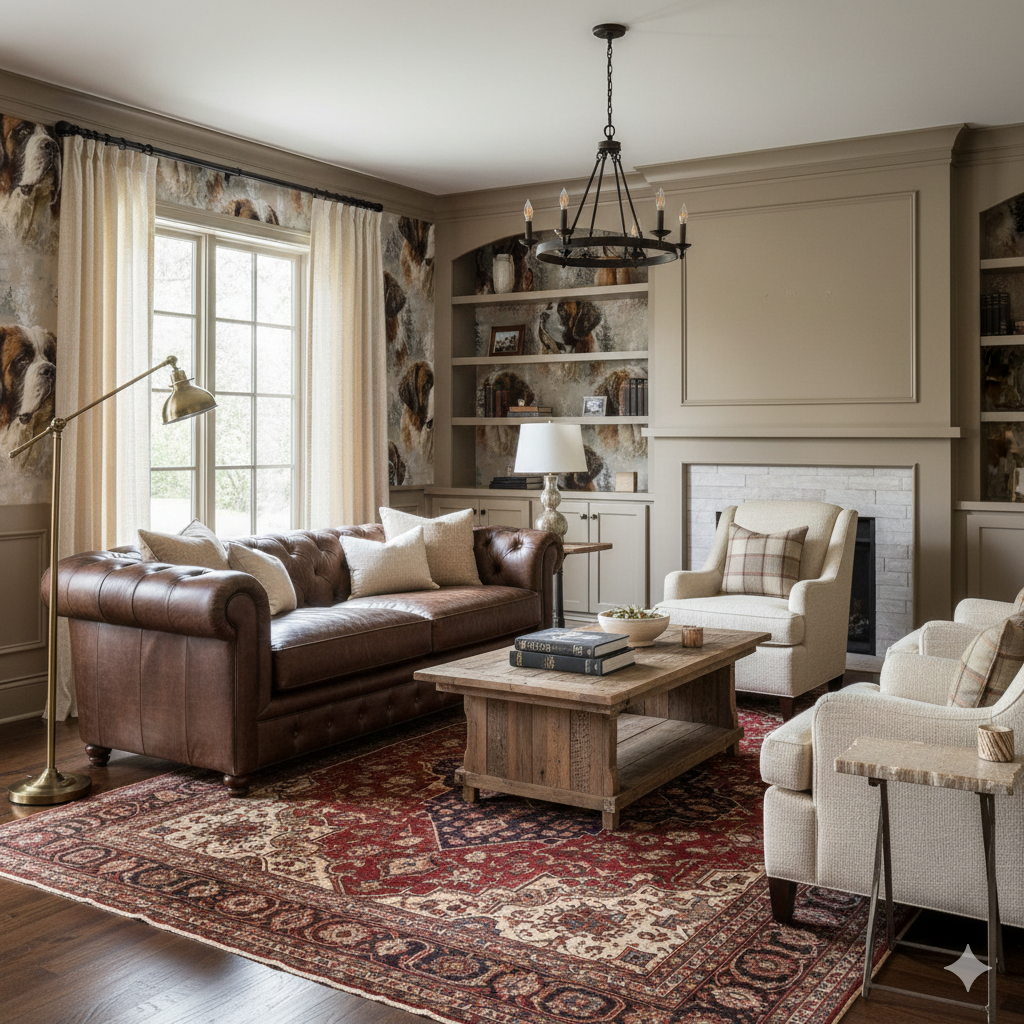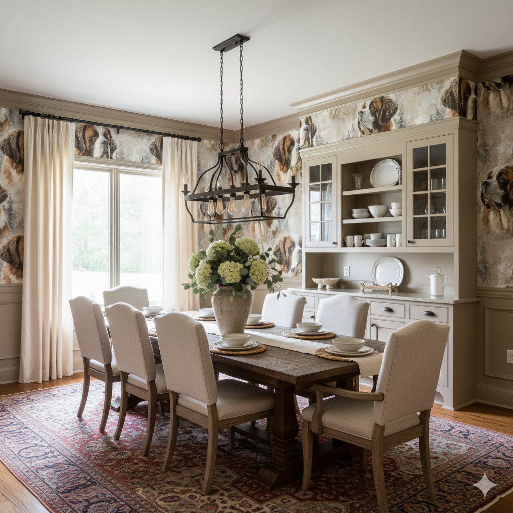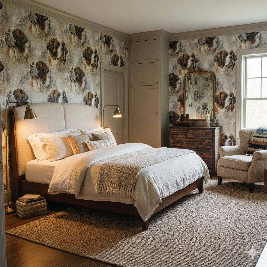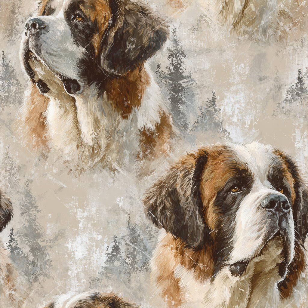 Noble and nostalgic, this pattern features Saint Bernards rendered in impressionistic detail — thick coats in cream, chestnut, and soft gray stand out against an aged plaster backdrop brushed with alpine silhouettes. There’s a cinematic warmth here: a blend of mountain monastery romance and old-world oil portraiture. “Saint Brumaire” embodies rustic grandeur — perfect for chalets, cabin great rooms, or heritage-inspired spaces that favor European country refinement. The muted neutral base keeps it elegant, while the expressive brushwork introduces heart and history.